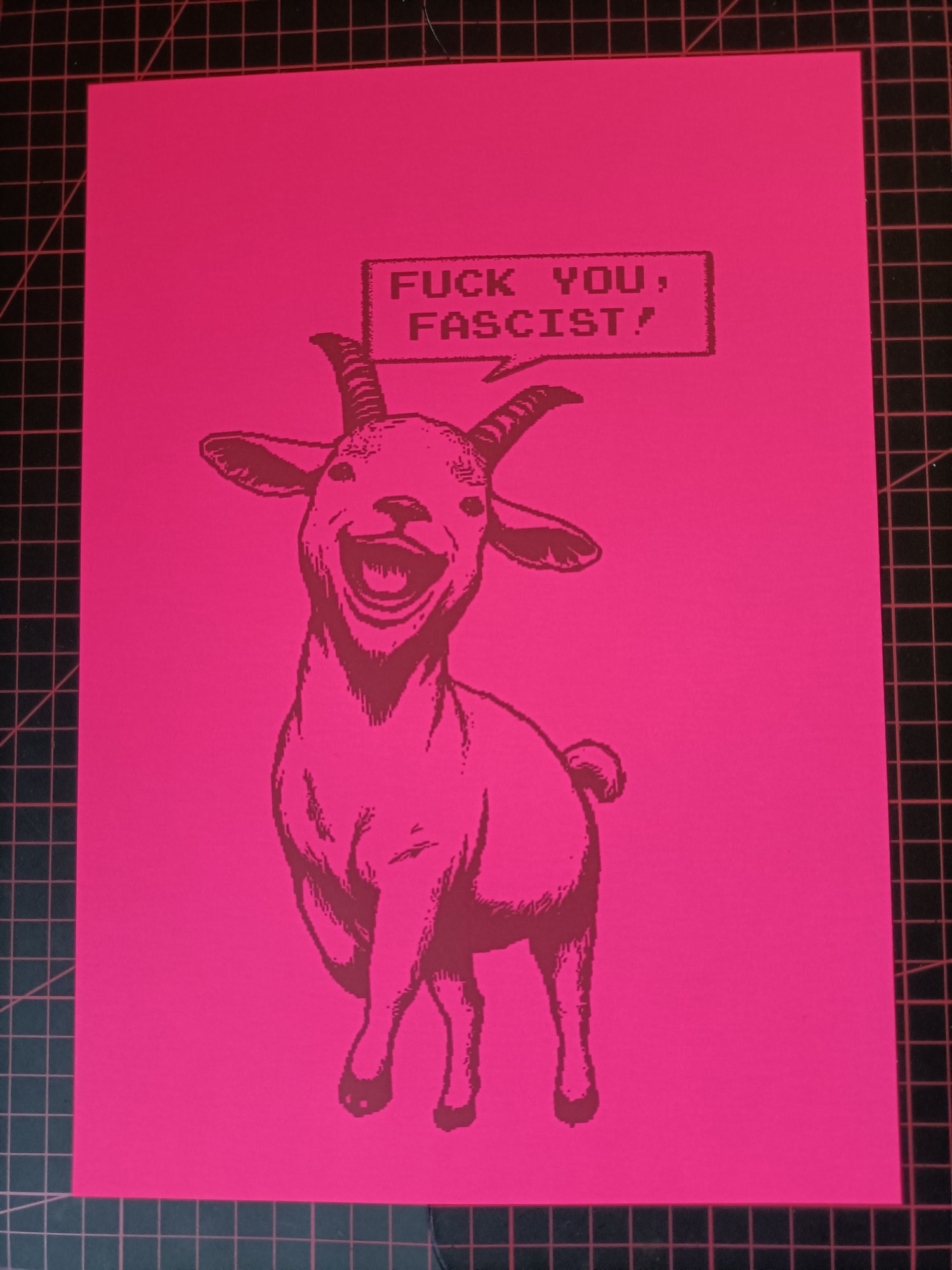 The Scapegoat says: Fuck you, Fascist!, Print A4 on flourescent paper.