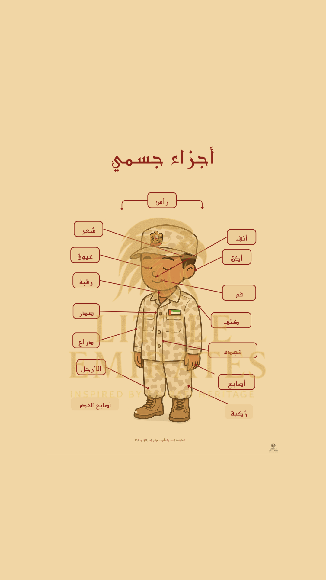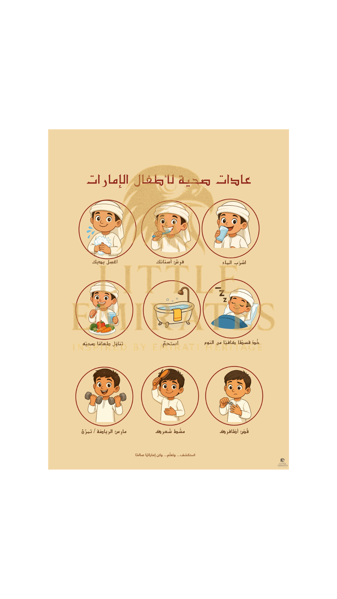 بوسترات تعليمية عربية مستوحاة من تراث الإمارات، تساعد الأطفال على التعرّف على المهن، المشاعر، العادات الصحية، أجزاء الجسم، ومهارات الحياة اليومية…