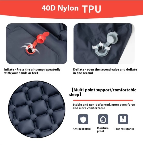 The integrated auto-inflation valve allows for quick setup using hand or foot pressure, eliminating the need for external pumps. Its moisture-resistant surface and compact packed size make it suitable for camping, car travel, and extended outdoor stays.