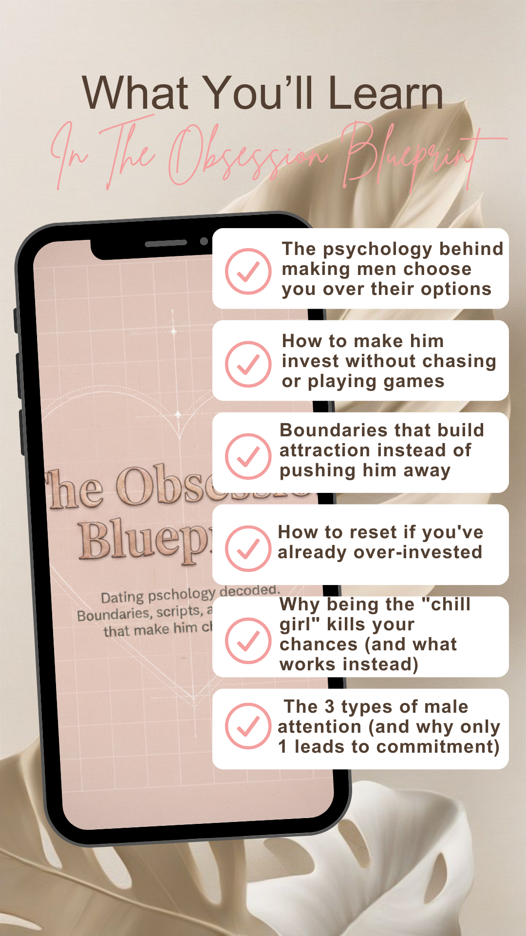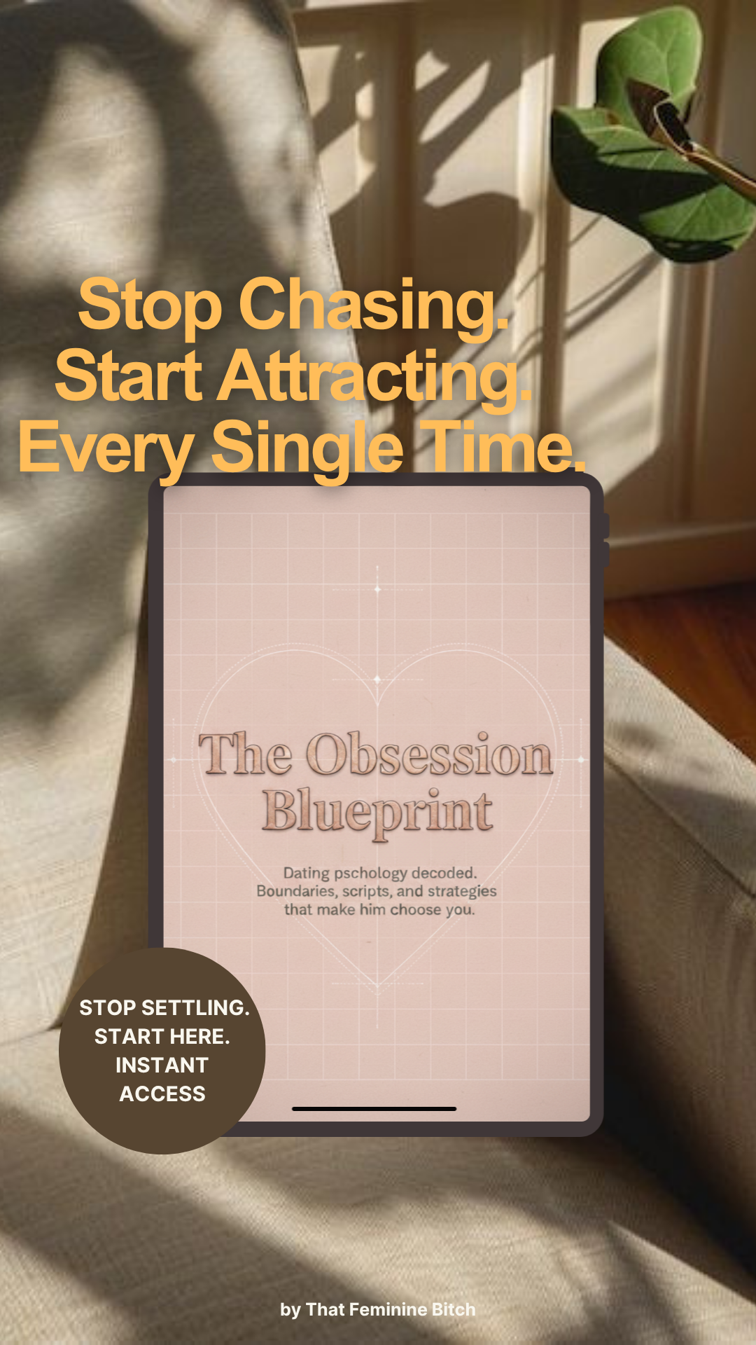 THE OBSESSION BLUEPRINT is the complete modern dating system for women who are done accepting breadcrumbs. No fluff. No "just be mysterious" advice. Just real psychology, proven scripts, and the boundaries that make men actually step up.