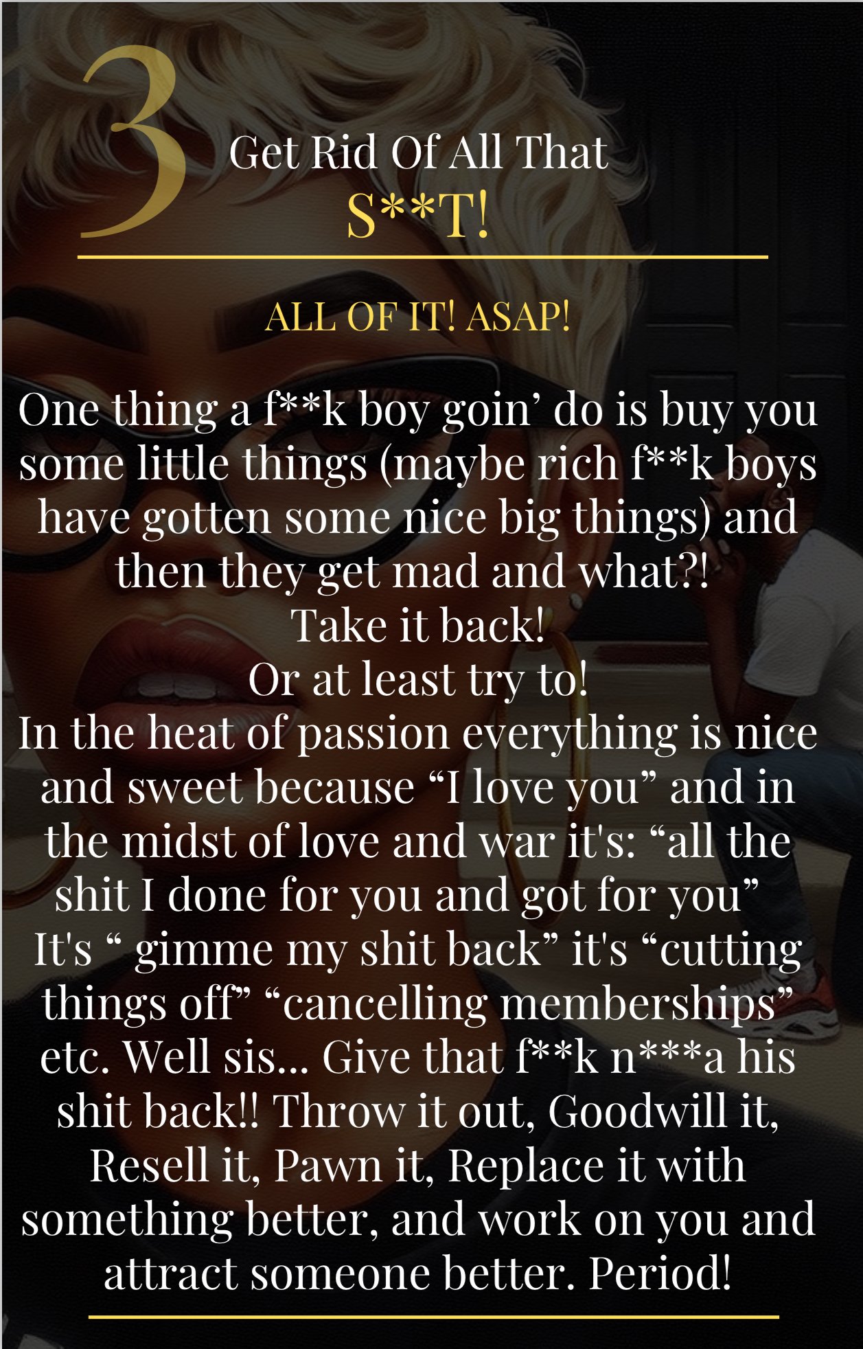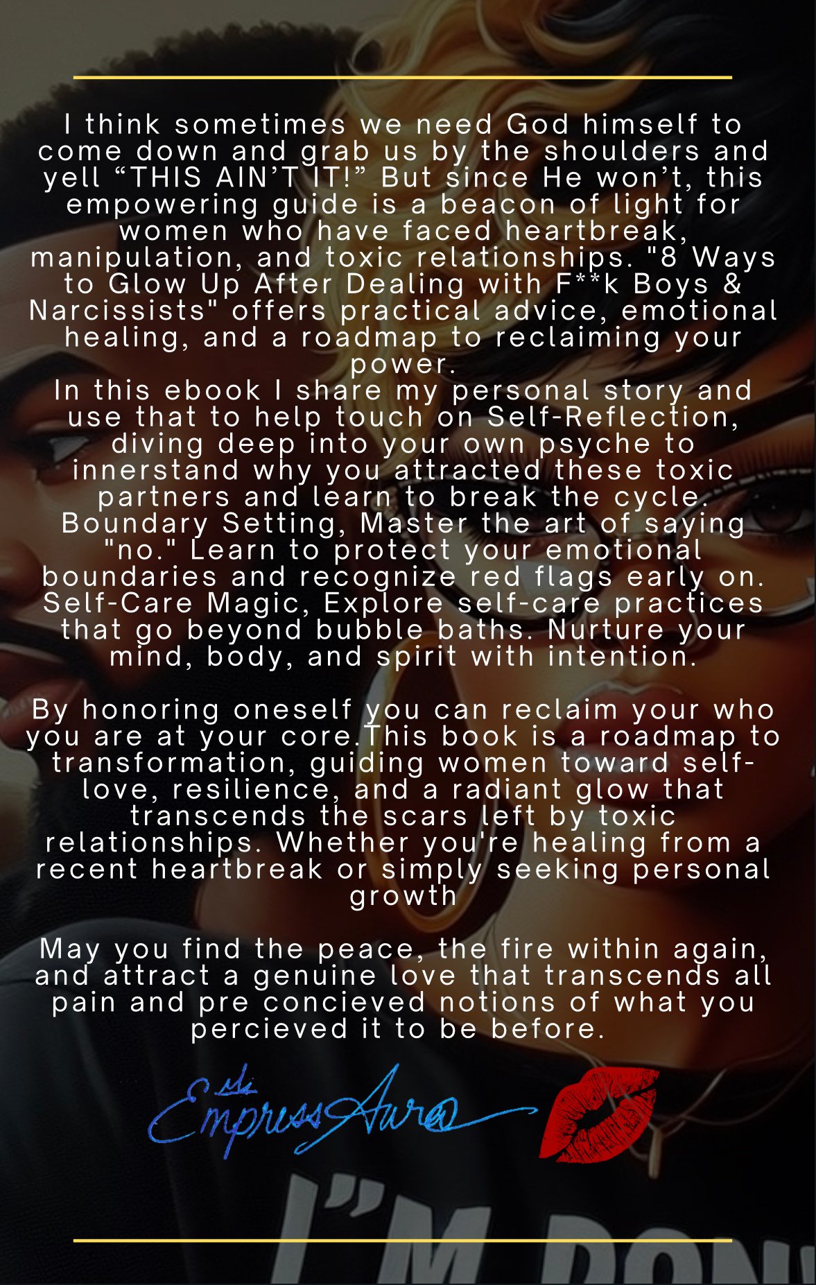 I think sometimes we need God himself to come down and grab us by the shoulders and yell "THIS AIN'T IT!" But since he won't, this empowering guide is a beacon of light for women who have faced heartbreak, manipulation, and toxic relationships. "8 Ways to Glow Up After Dealing with F**k Boys & Narcissists" offers practical advice, emotional healing, and a roadmap to reclaiming your power.