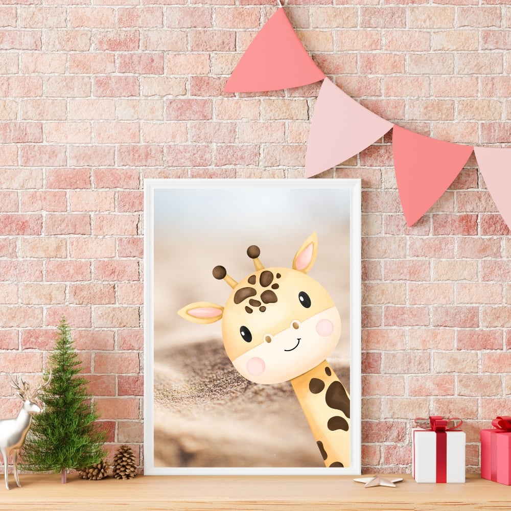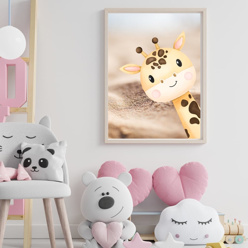 Agrega un toque de suave ternura al espacio de tu pequeñ@ con esta adorable lámina decorativa de jirafa bebé para la habitación infantil.