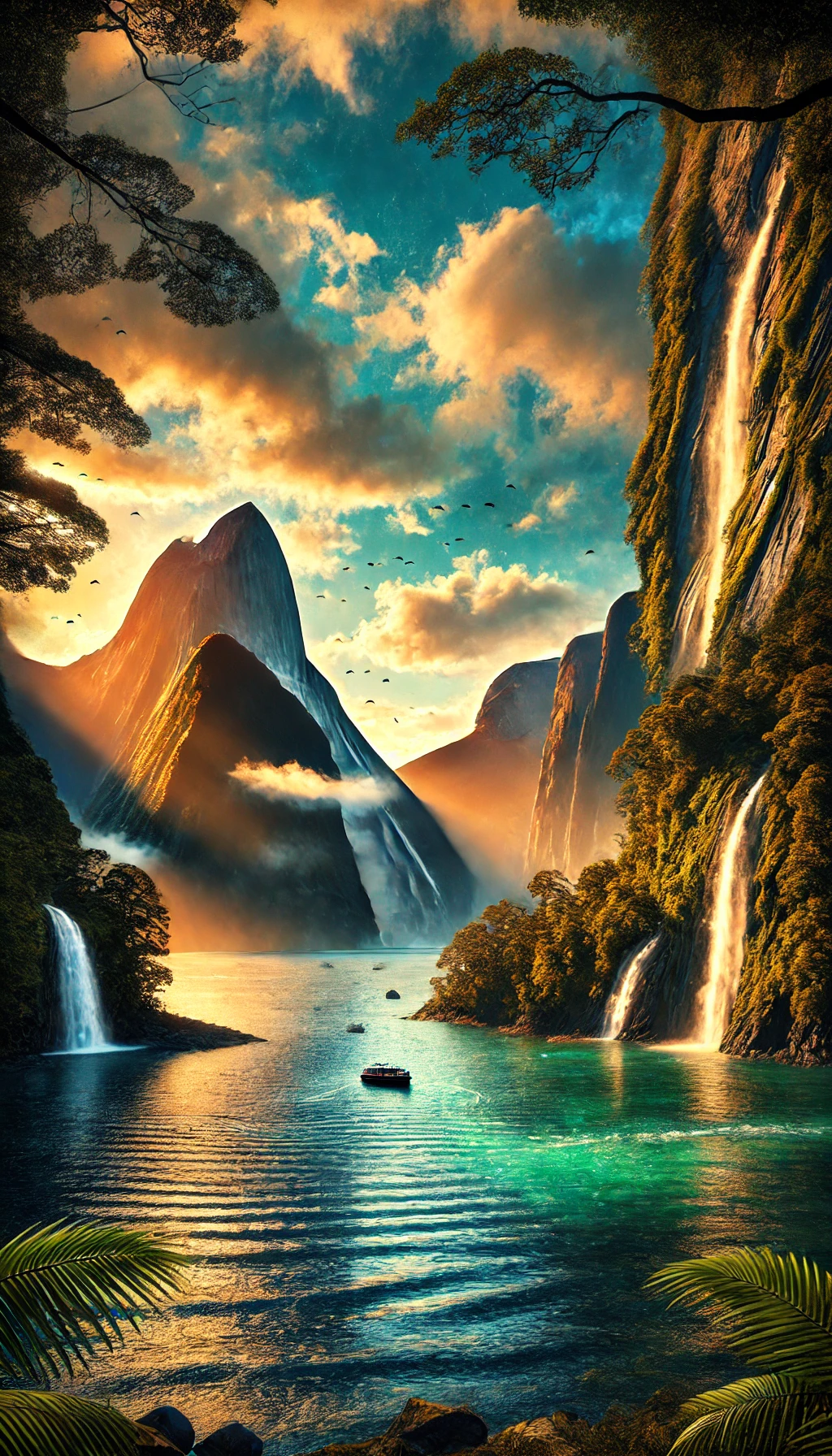 A breathtaking portrait of Milford Sound, New Zealand’s crown jewel and one of the world’s most awe-inspiring natural wonders. Towering cliffs of the fjord soar from emerald waters, cloaked in lush rainforest and cascading waterfalls. A golden sunset spills across the peaks, while gentle mist hovers above the bay like breath from the Earth itself.
