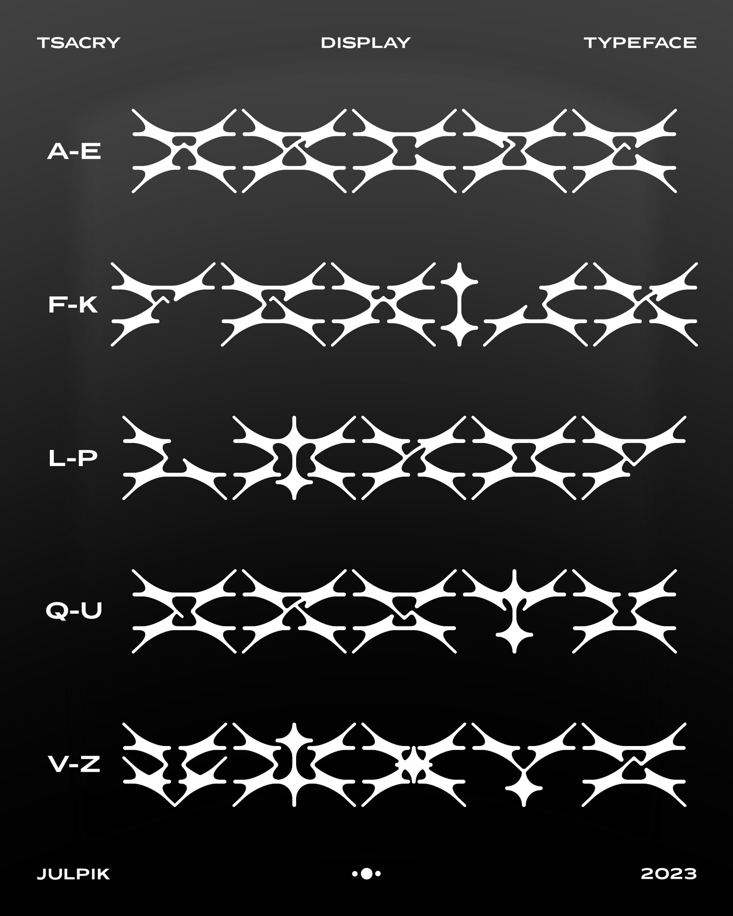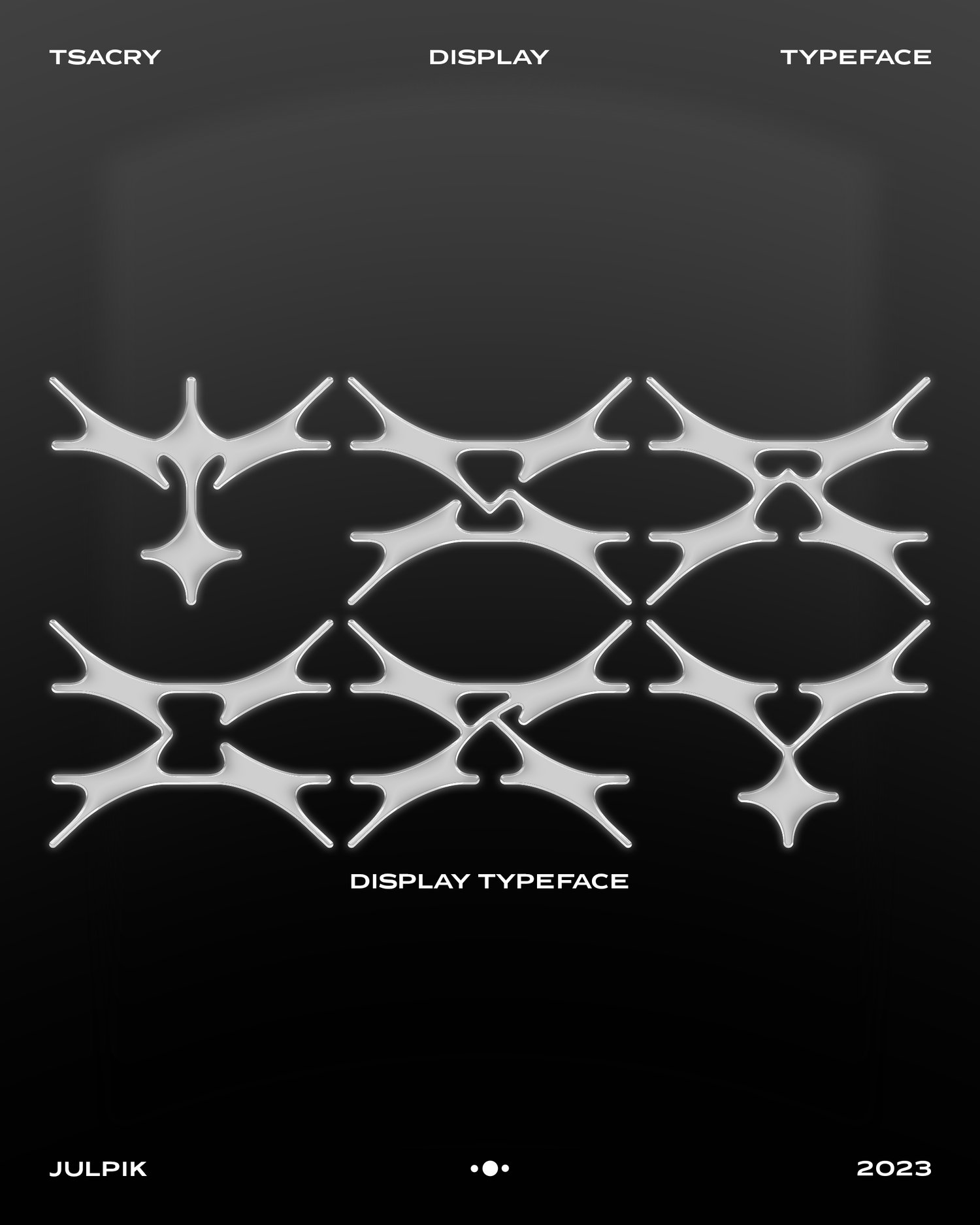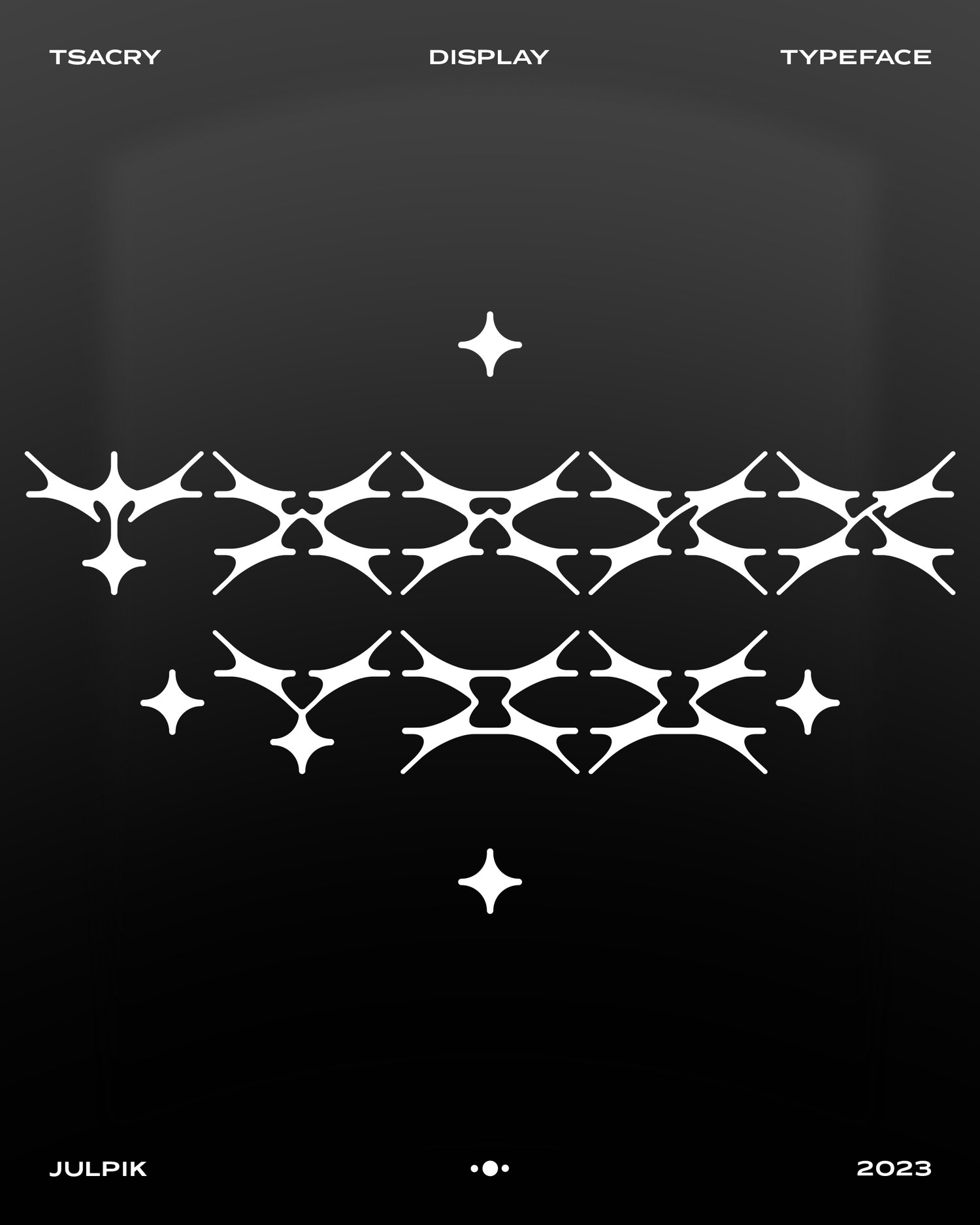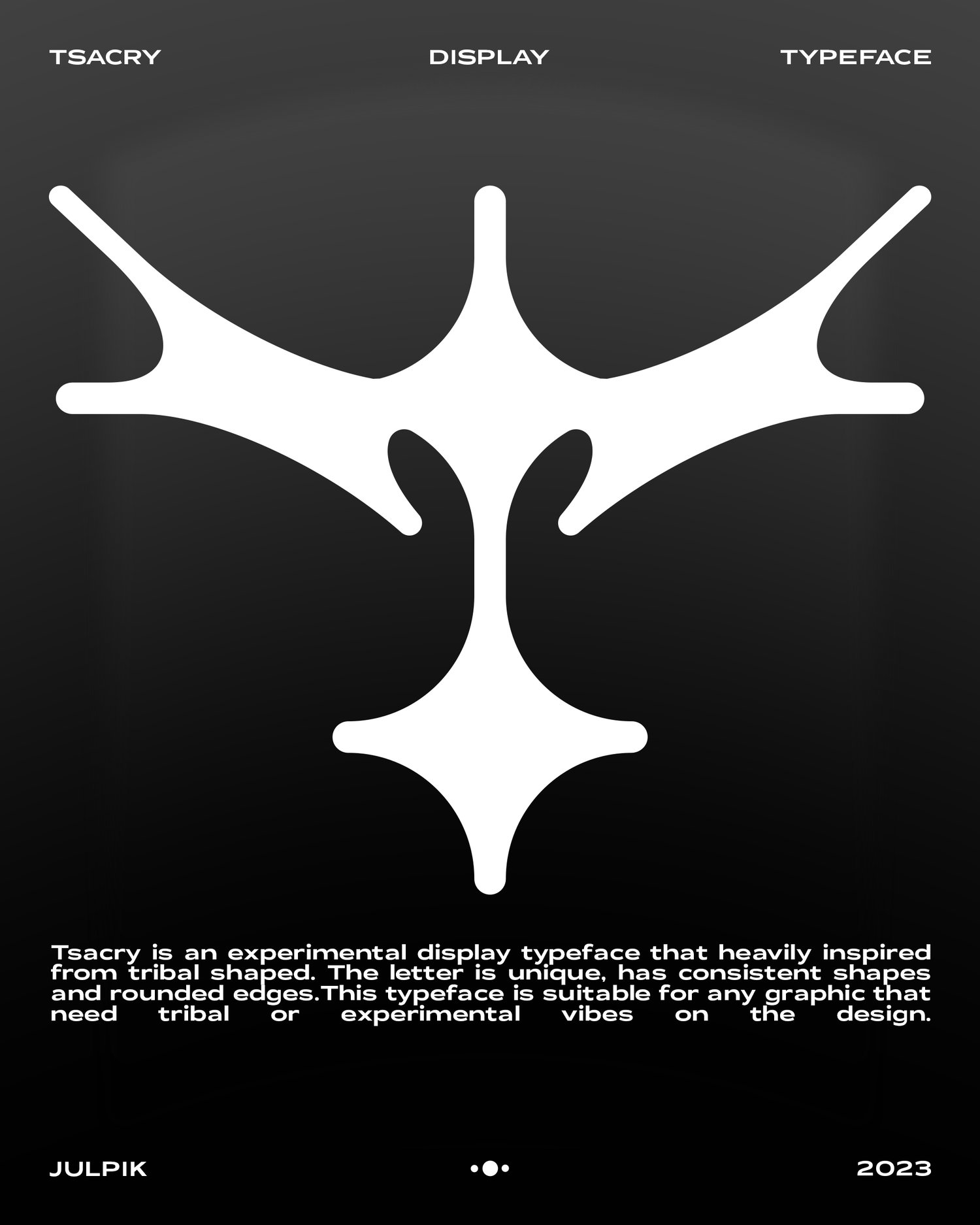 Tsacry is an experimental display typeface that heavily inspired from tribal shaped. The letter is unique, has consistent shapes and rounded edges.This typeface is suitable for any graphic that need tribal or experimental vibes on the design.