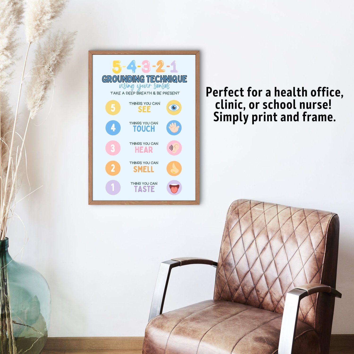 5-4-3-2-1 Grounding Techniques Poster: Mindfulness Tool for Anxiety | Therapy Wall Art for Calming Corner, Kids Mental Health, School Nurse