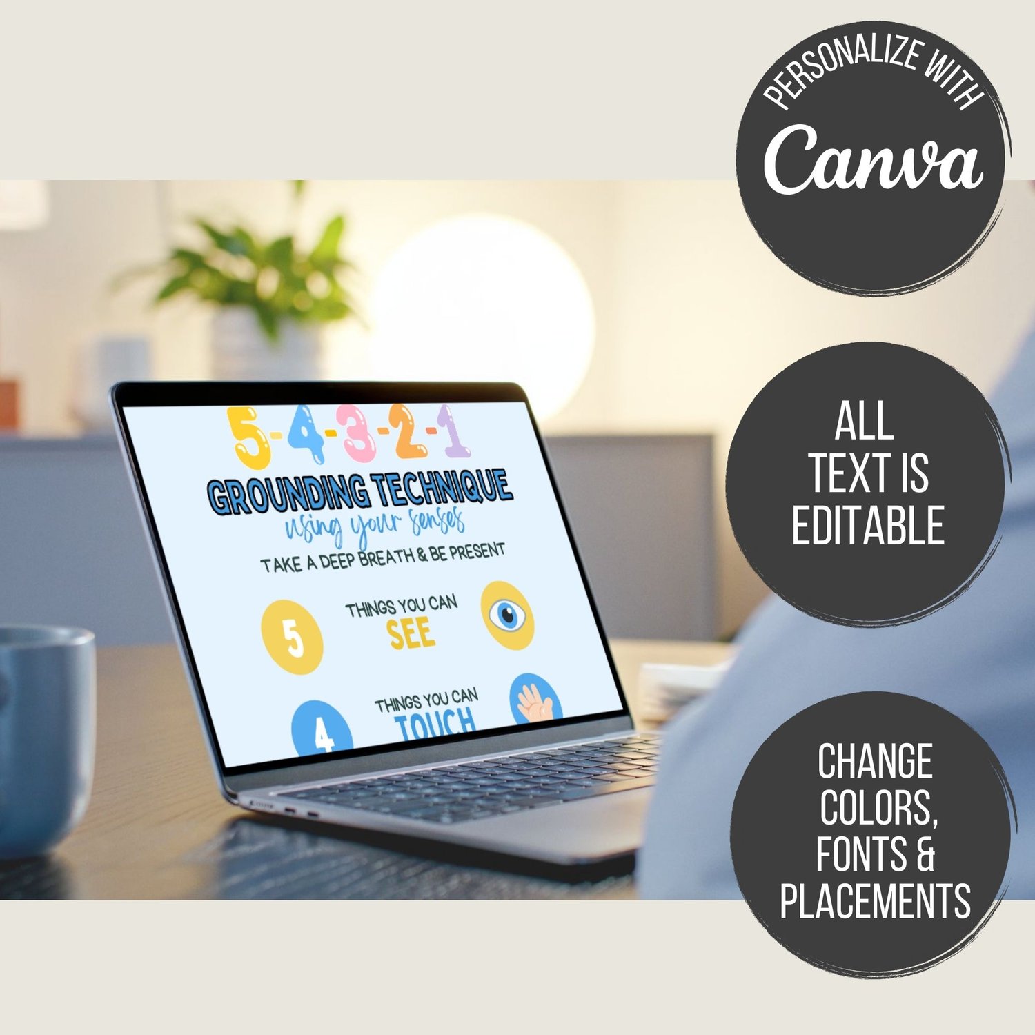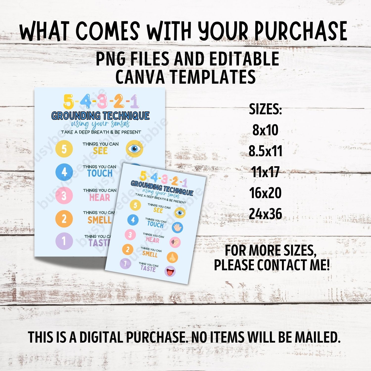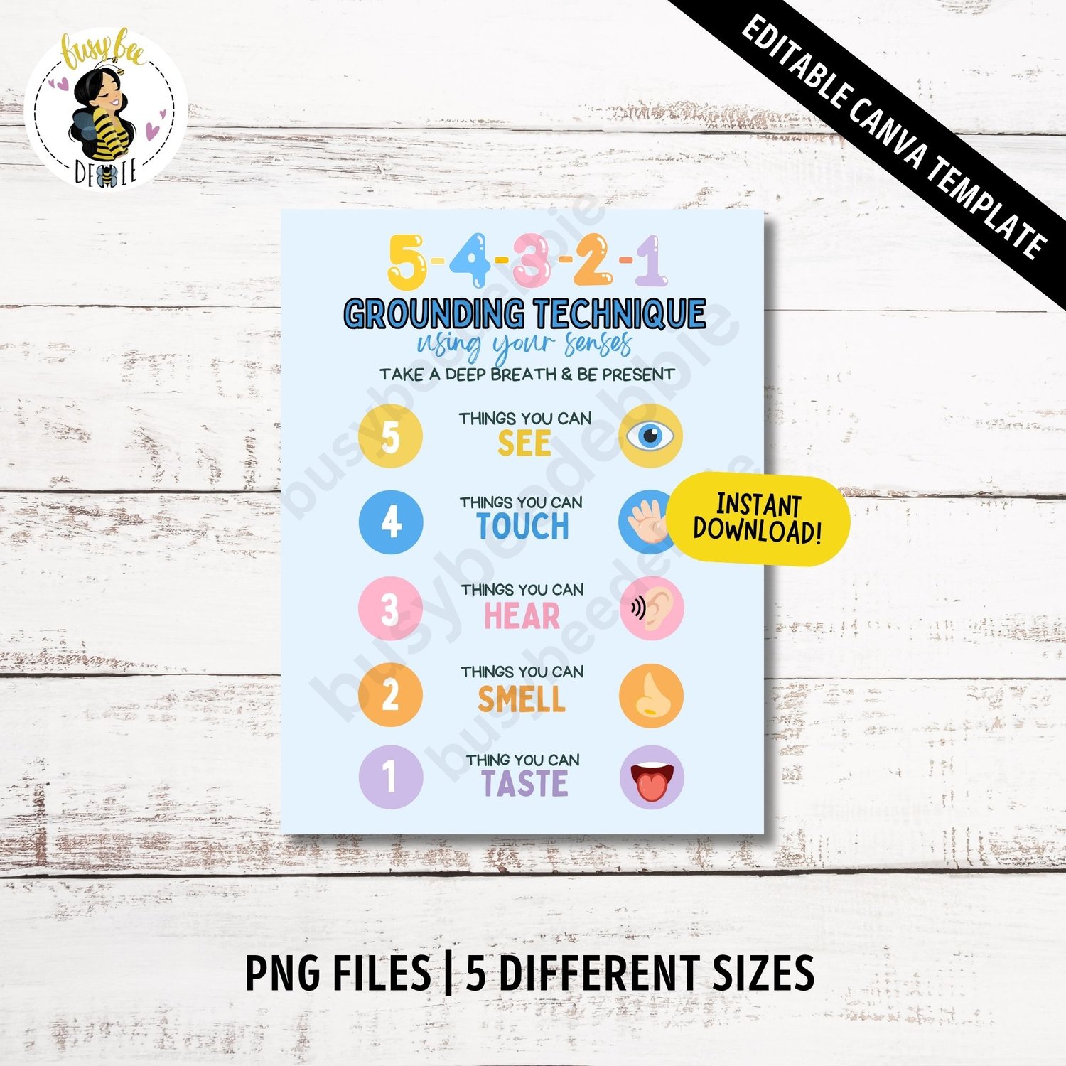 This editable 5-4-3-2-1 Grounding Technique poster template helps kids manage anxiety with a simple, calming senses-based exercise they can use anytime. Fully customizable in Canva, it’s perfect for school nurses, teachers, counselors, and pediatric psychiatric NPs to display in offices, classrooms, calm corners, and therapy spaces.