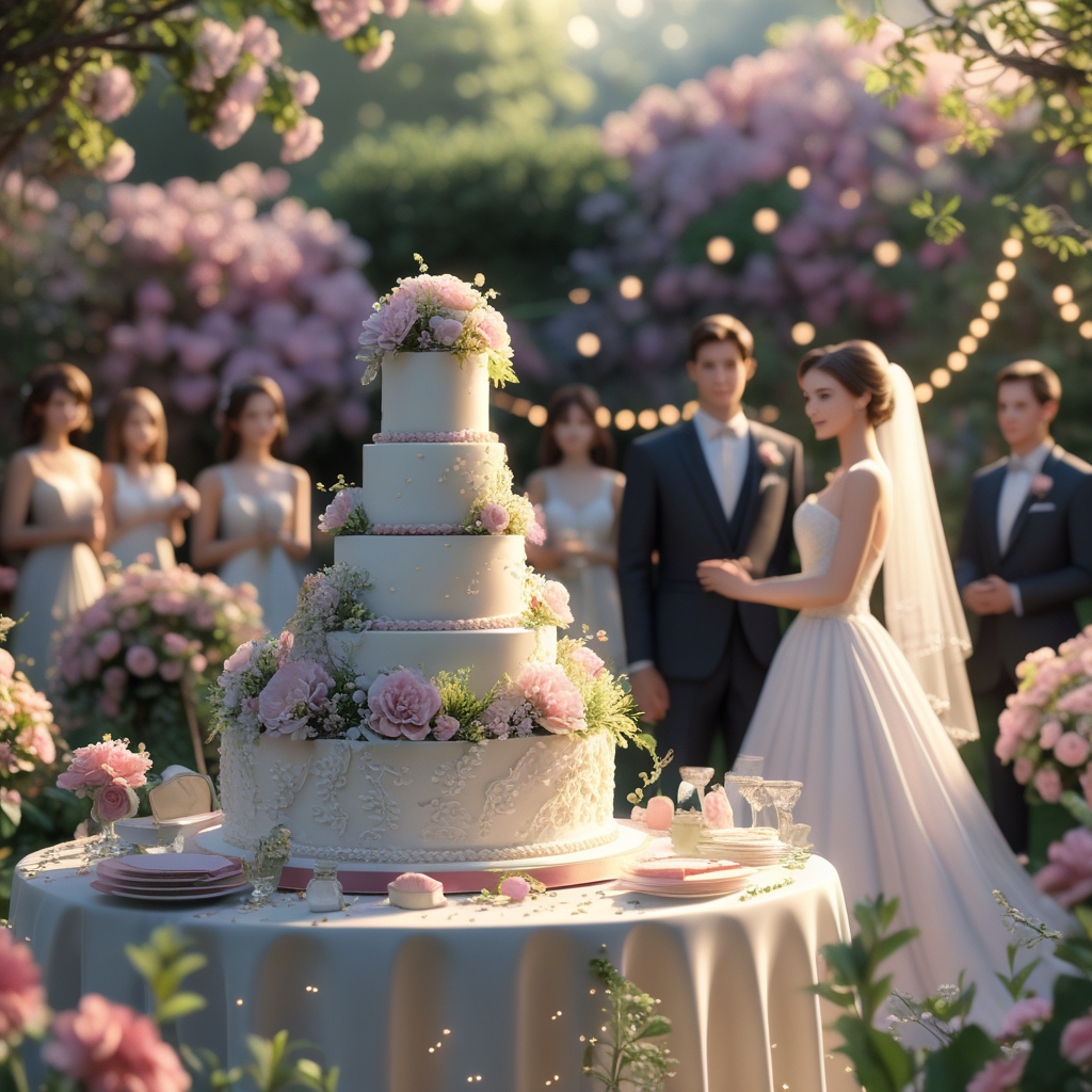 “A beautiful outdoor wedding scene set in a lush garden filled with blooming flowers and soft sunlight. A stunning multi-tiered wedding cake sits elegantly on a decorated table, adorned with delicate floral arrangements and intricate icing details. The bride and groom stand nearby, surrounded by elegantly dressed guests, twinkling fairy lights, and soft pastel decorations. The scene captures a romantic, joyful atmosphere with ultra-realistic details, warm lighting, and a dreamy, cinematic quality.”