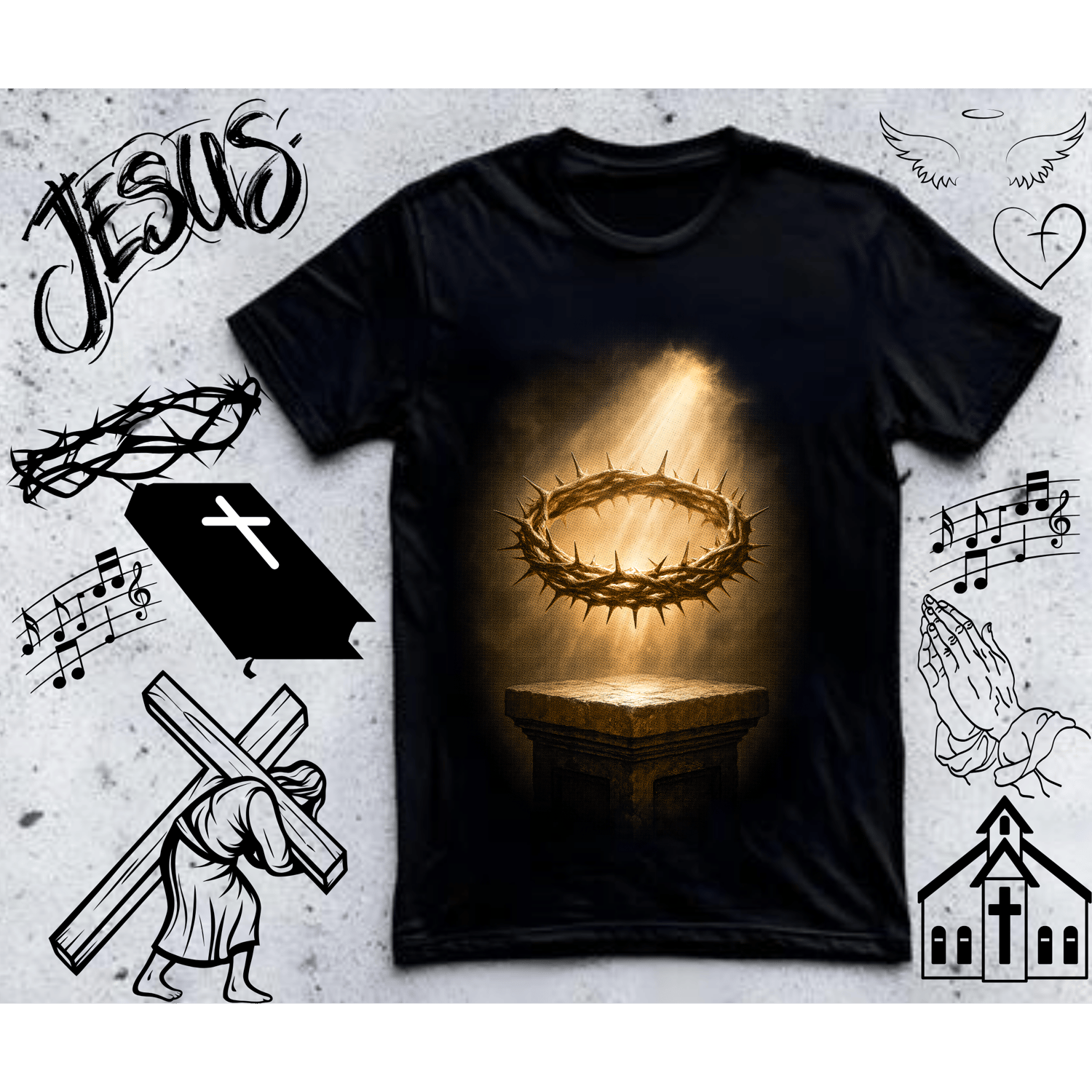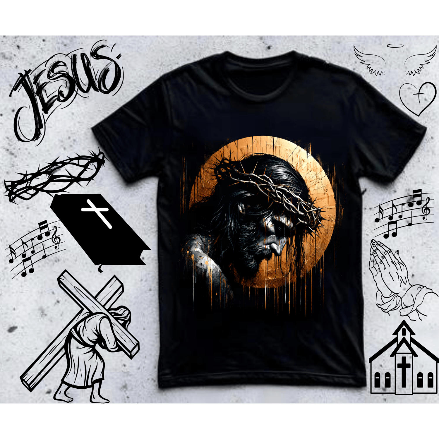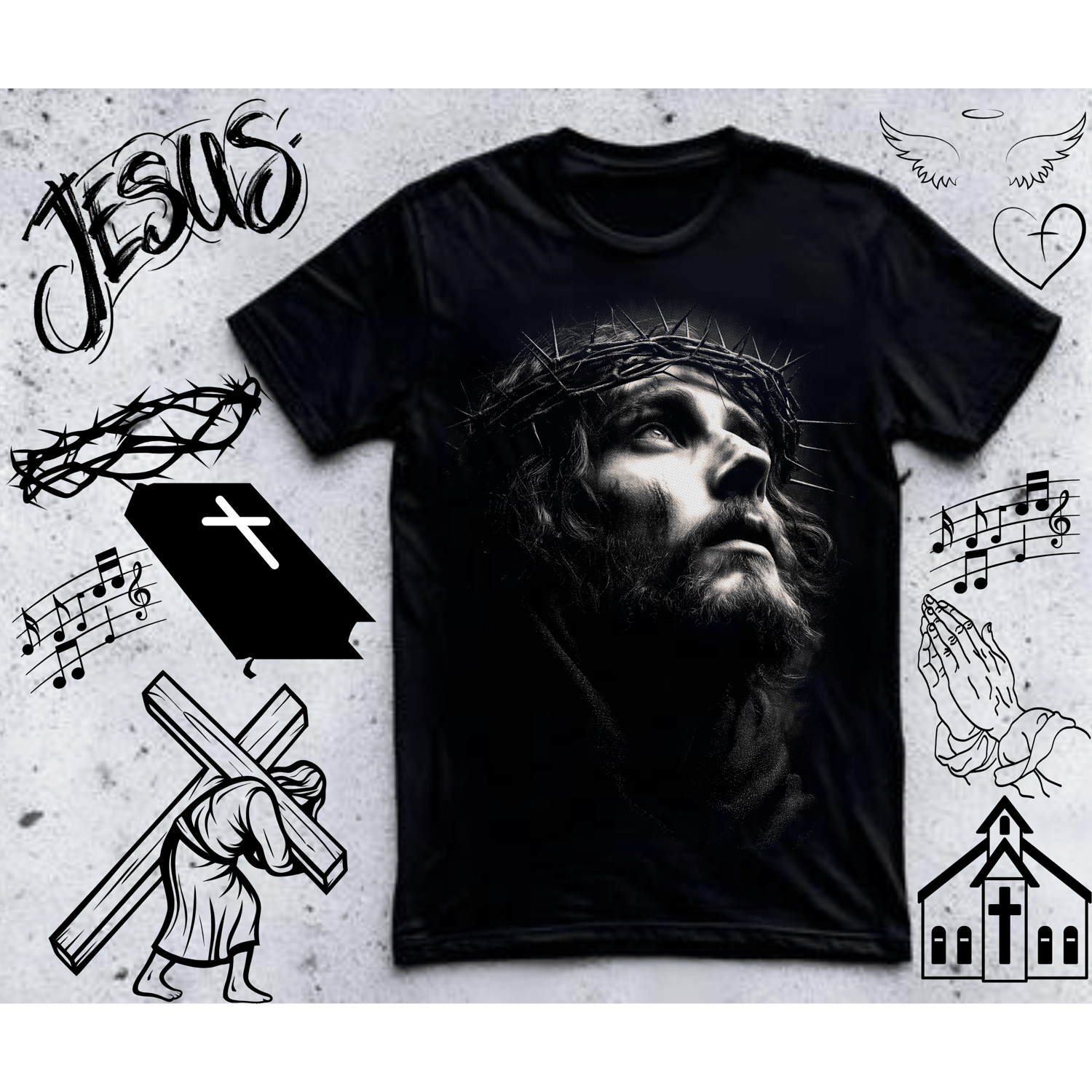 This inspiring halftone religious designs bundle includes 25 faith-based retro-style designs perfect for creating Christian and religious merchandise. Get incredible value with this comprehensive pack of halftone graphics featuring crosses, scripture, and faith themes.