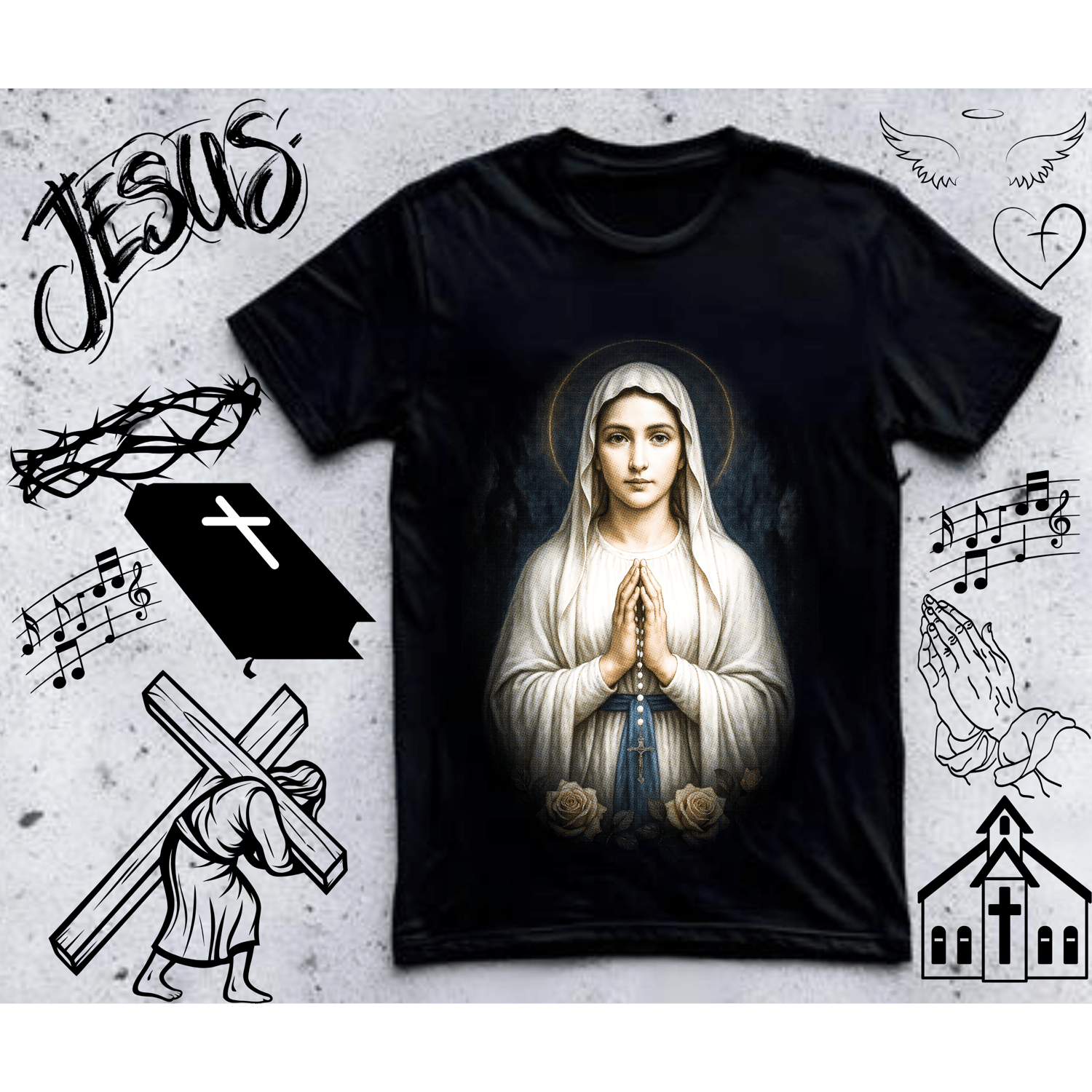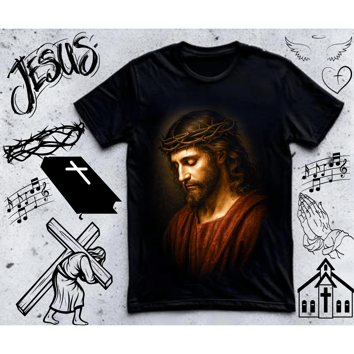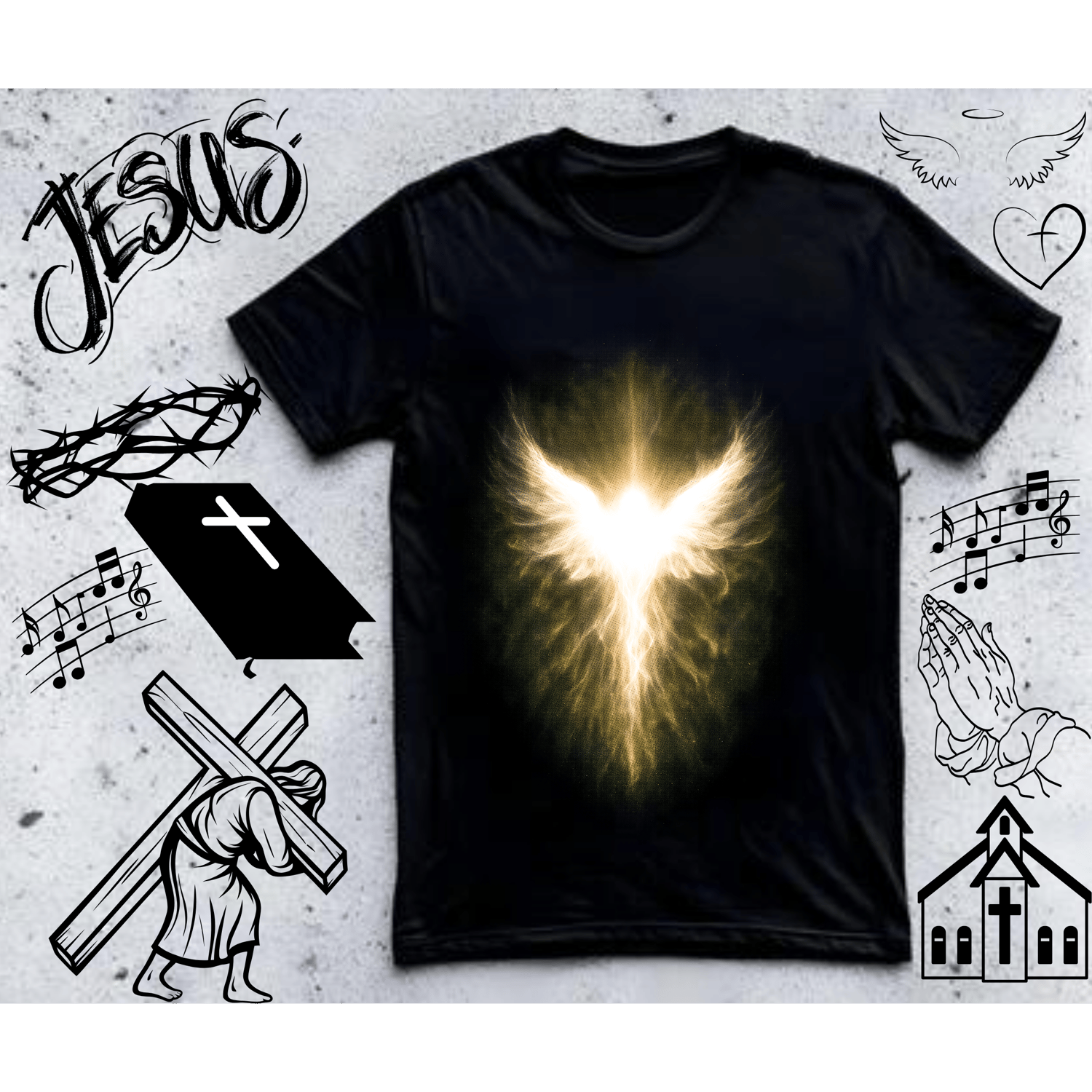 This inspiring halftone religious designs bundle includes 25 faith-based retro-style designs perfect for creating Christian and religious merchandise. Get incredible value with this comprehensive pack of halftone graphics featuring crosses, scripture, and faith themes.