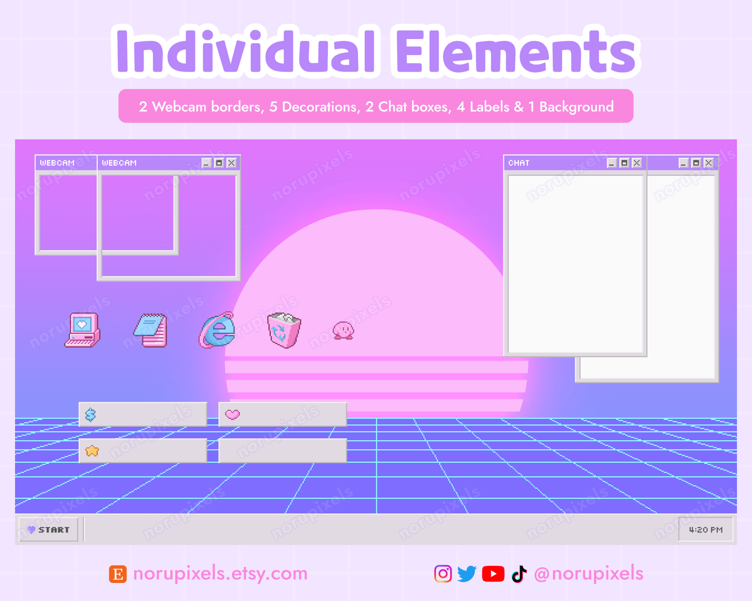 - Individual elements from overlay: 2 game borders, 2 webcam borders, 5 decorations, 2 chat boxes, 4 labels & 1 background (.PNG format)