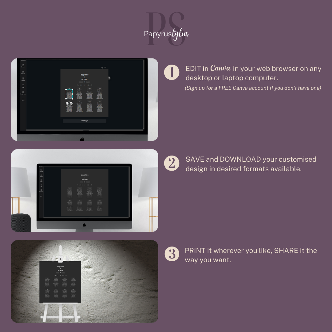 Seating chart in unusual square shape, with simple and minimalist layout. The easy-to-customise template comes with two sizes available, you may change the font and colour to better match the theme of your Big Day!