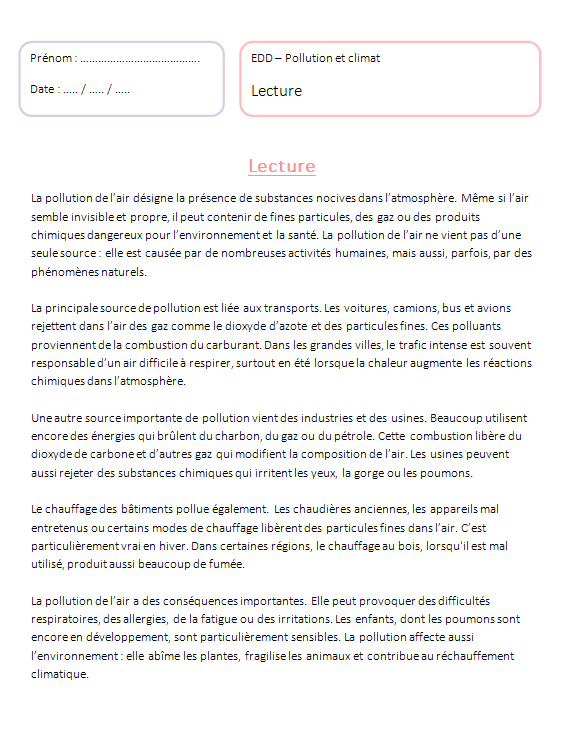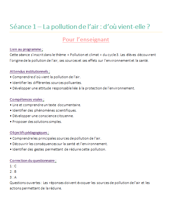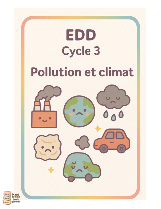 Cette sĂ©quence complĂšte de 6 sĂ©ances EDD pour le Cycle 3 permet dâaborder la pollution et le climat de maniĂšre simple, structurĂ©e et adaptĂ©e aux Ă©lĂšves de CM1, CM2 et 6e.
