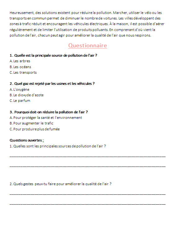Elle aide les Ă©lĂšves Ă comprendre les grandes causes de pollution (air, eauâŠ), Ă faire le lien avec le changement climatique, et Ă identifier des gestes concrets pour agir au quotidien.
