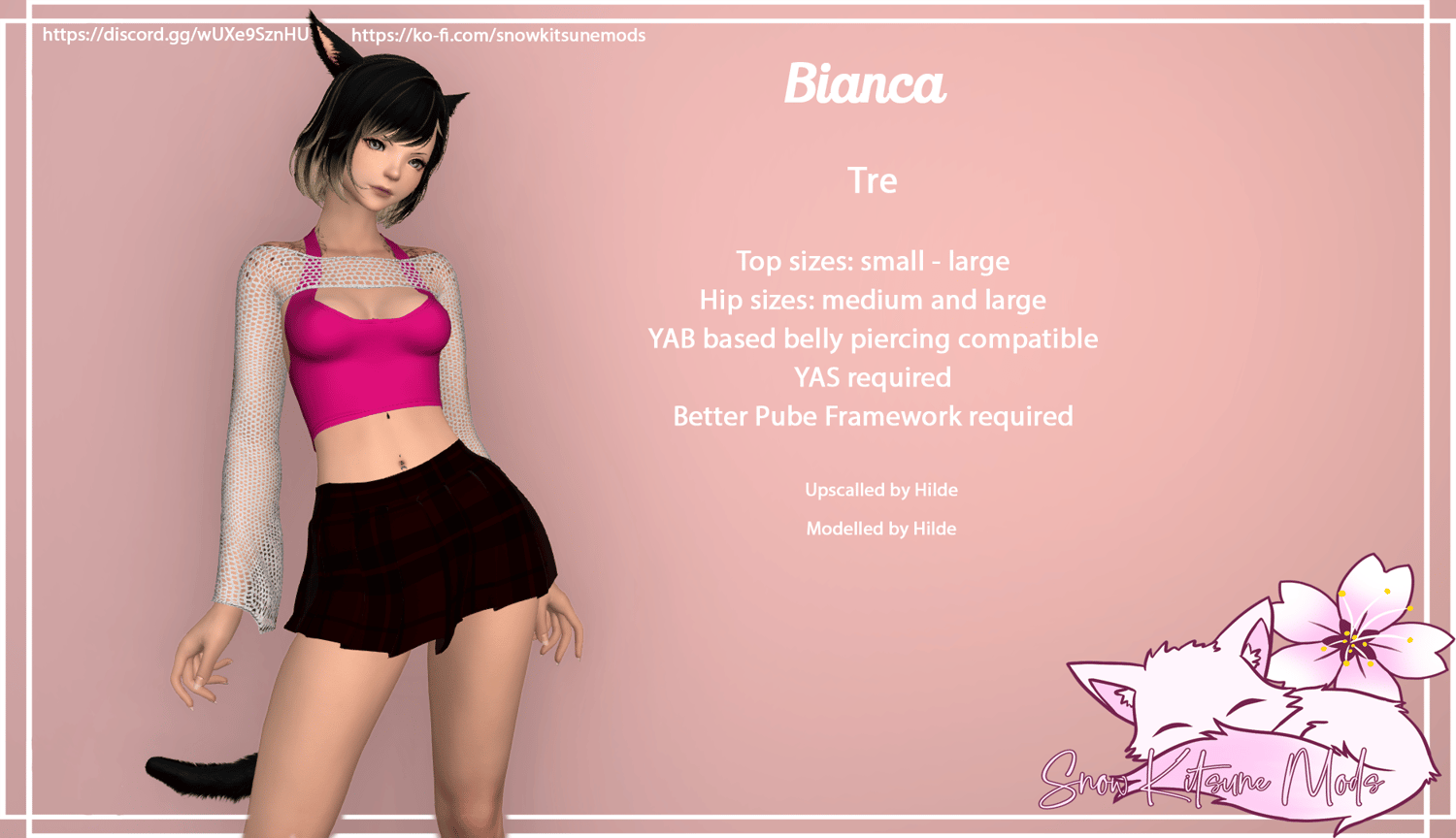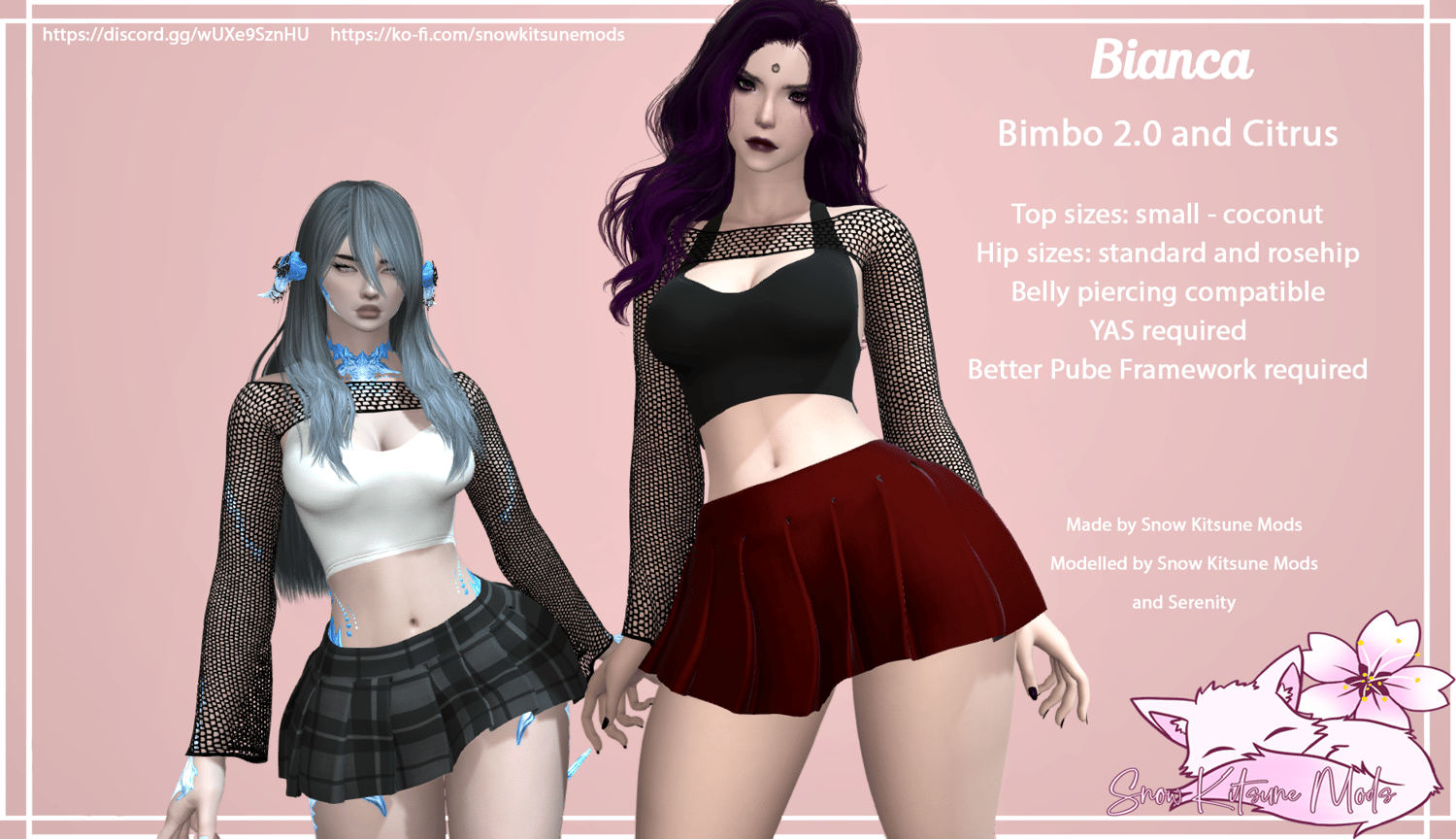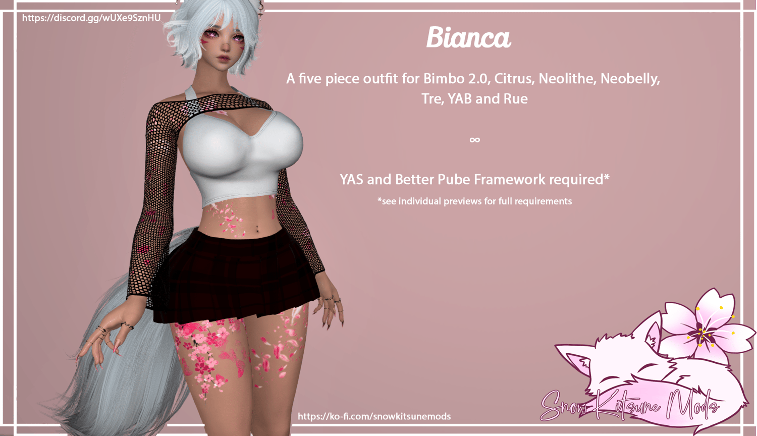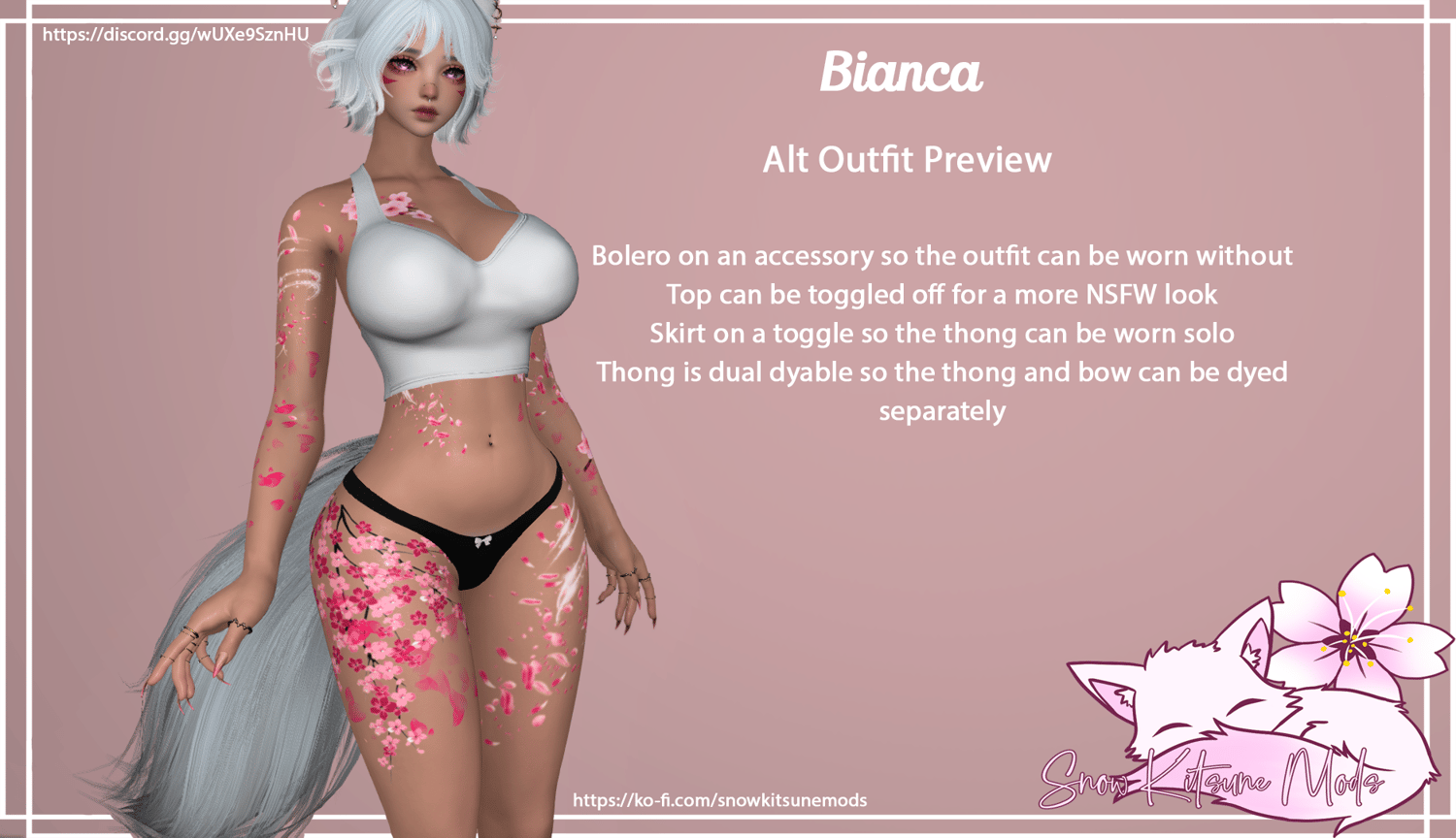 Bianca is a five piece outfit made both from scratch (halter top, bolero and thong) and licensed assets (skirt and shoes). This mod was made using Blender, Marvelous Designer, Substance Painter and Photoshop.