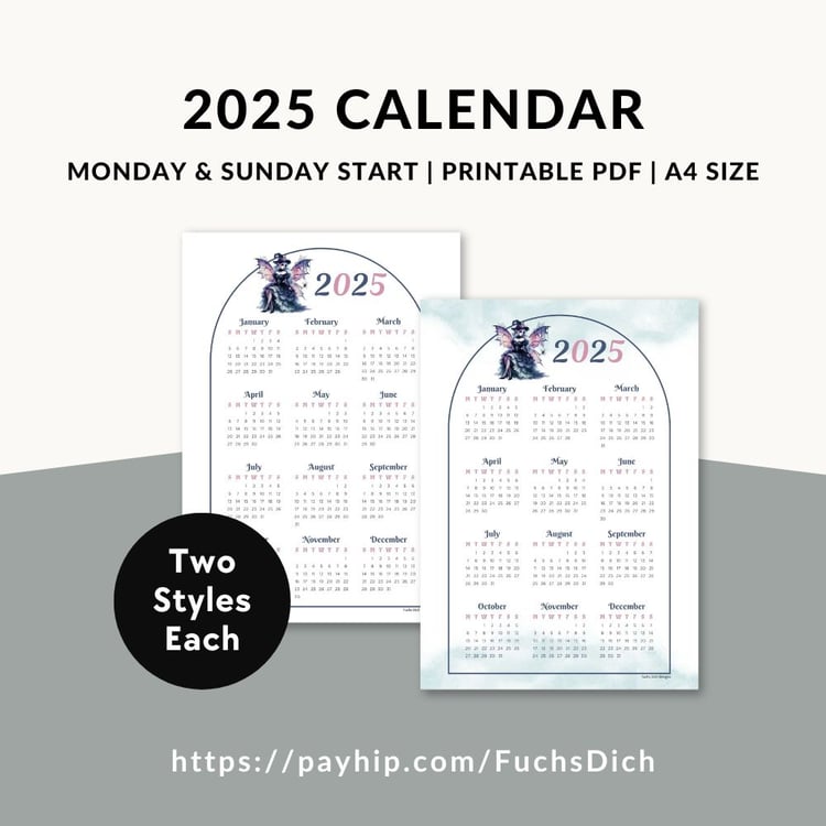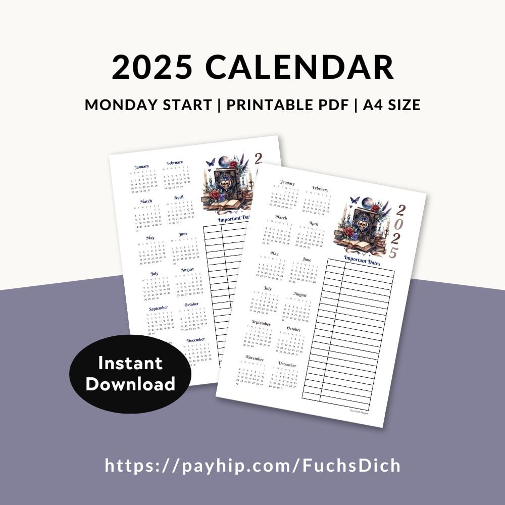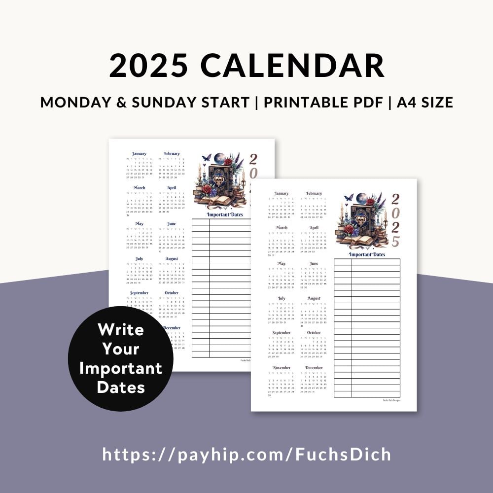 Stay organized in year 2025 with our cute printable yearly calendar with important dates! Available in Monday and Sunday starts. This A4 size year 2025 calendar is perfect for any workspace. Choose between Monday or Sunday start versions to suit your planning style. Whether you print it or use it digitally, this calendar will help you stay on top of your schedule and goals throughout the year of 2025.