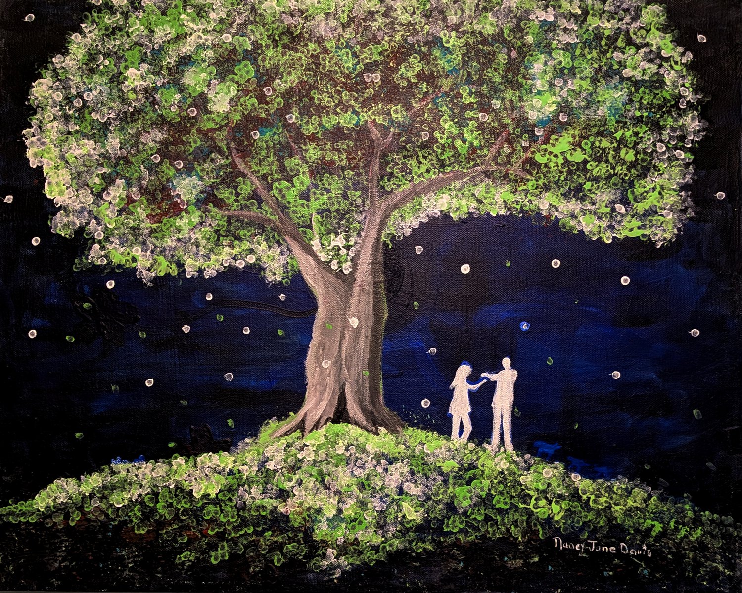 Enchanting original acrylic painting on canvas. A couple sharing a moment outside under the stars to share a moment to manifest their dreams. Fireflies and stars dancing around with a deep midnight blues and vibrant greens, creating a dreamy atmosphere. A perfect piece for encouraging manifesting teamwork.