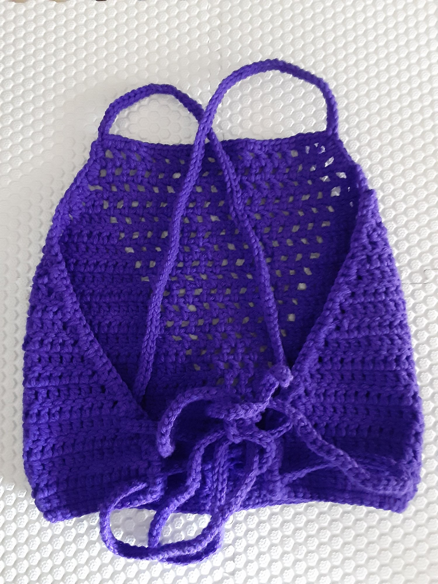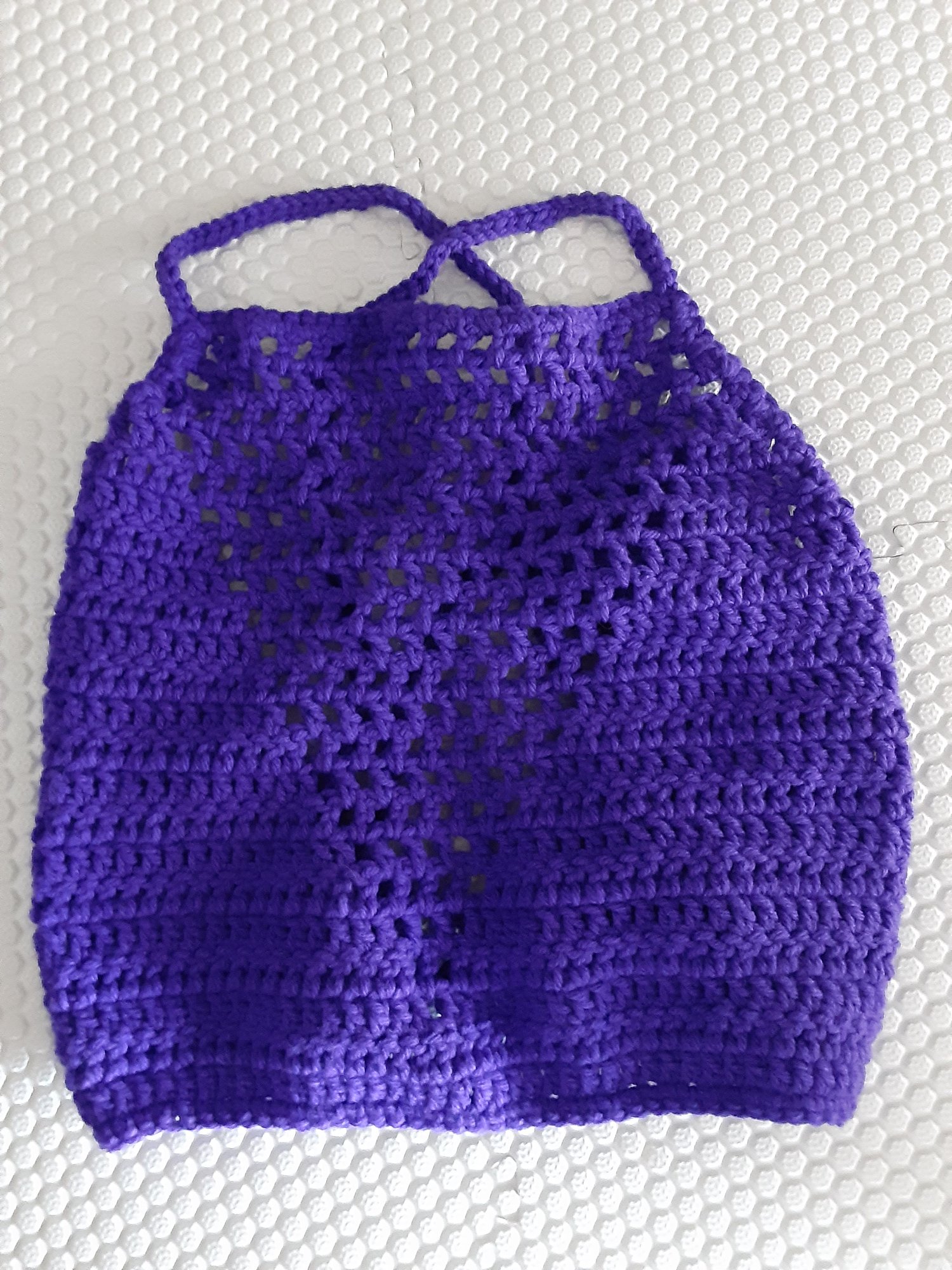 The item features a distinctive V-Outline Mesh Pattern that gradually expands toward the center, creating a flattering and eye-catching silhouette. It has adjustable back straps designed to slide comfortably over your head, with ties in the back to customize your fit. Perfect for layering or wearing on its own during warmer seasons, this piece is both breathable and lightweight. The handcrafted finish includes careful construction using double crochets and slip stitches, resulting in a clean, refined look. Made with high-quality worsted-weight acrylic yarn, it offers durability, softness, and easy care.