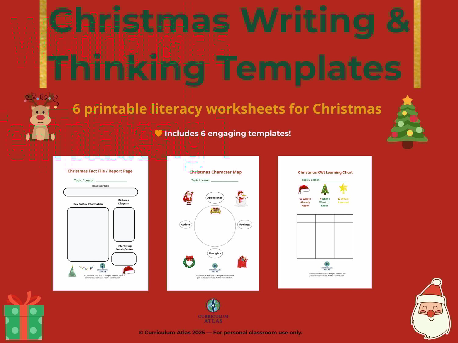Bring Christmas cheer into your literacy lessons with these Curriculum Atlas Writing & Thinking Templates — a beautifully designed pack of festive printable worksheets to support writing development, reflection, and creativity.