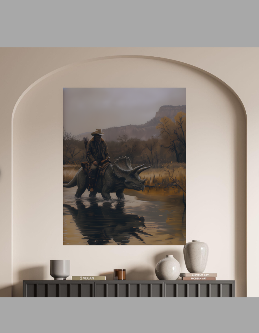 Elevate your space with this captivating digital art download featuring a rugged cowboy atop a fierce dinosaur, splashing through a misty western frontier landscape in classic oil painting style. Ideal for printable wall art, posters, or home decor enthusiasts seeking unique fantasy western vibes. High-resolution PNG file for instant digital download – perfect for dinosaur art lovers, cowboy artwork collectors, and sci-fi western fans.