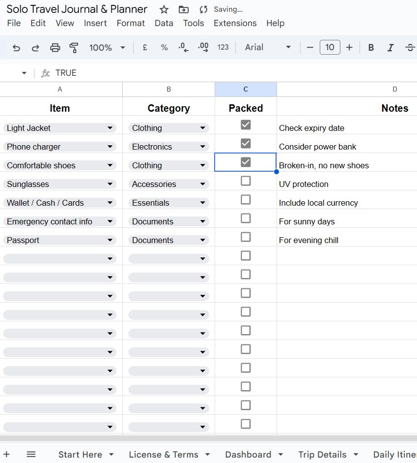 Item, Category, Packed status & Notes