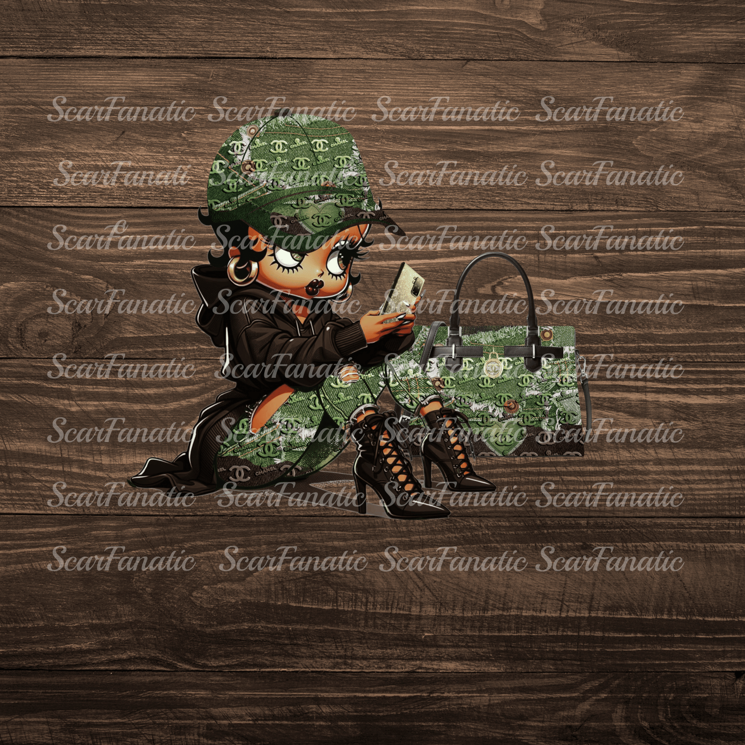 Black Betty Boop in Brown Sweatshirt, Green and Brown Denim Chnl Ball Cap, Blue and Brown Denim Chnl ripped jeans/leggings, Matching Chnl Purse, Brown high heel boots, Sublimation, PNG, DTF, 300DPI, high resolution
