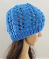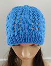 This quick knit, cosy 12ply Beanie has a 1x1 rib brim then is worked in a simple lace stitch which creates vertical eyelets.