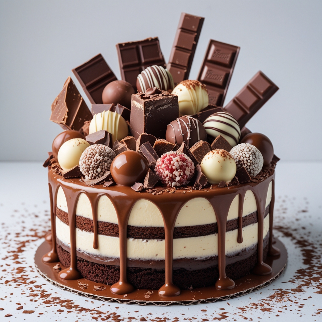 A decadent chocolate overload birthday cake with moist, velvety layers of rich, dark ganache, topped with an assortment of creamy truffles, crunchy chocolate bars, and overflowing with warm, golden dripping chocolate, all meticulously arranged in an indulgent style, set against a contrasting, crisp white background to accentuate the deep, bold colors of the chocolate, with the cake itself positioned centrally in the frame, surrounded by a subtle, delicate pattern of chocolate shavings and cocoa powder, with the overall effect evoking a sense of opulence and unbridled celebration.