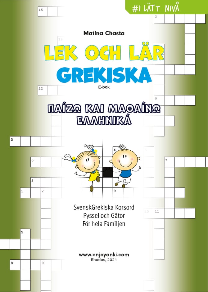 Roliga och lärorika svenskgrekiska korsord, pyssel och gåtor, ett speciellt läromedel för att lära sig och öva på grekiska. Instruktionerna ges på svenska och svaren ska ges på grekiska.