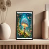 Transport your creations to an enchanting realm with this Magical Mushroom Forest image, captivating design of a blue jeweled mushroom glowing softly in a dreamy forest with twinkling lights and delicate butterflies, this digital download is perfect for crafters and small business owners looking to add a touch of whimsy and magic to their projects.