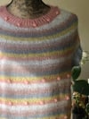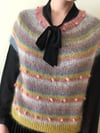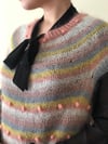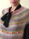 This is a cropped top-down sweater, very light and fluffy, knitted in the round, with stripes, moss stitch and bobbles.