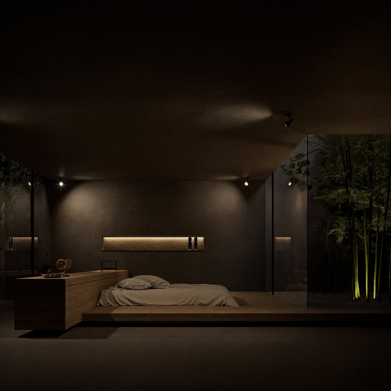 Rendered entirely in D5 Render, this bedroom scene explores the interplay of light and material in a tranquil, minimalist space connected to nature.