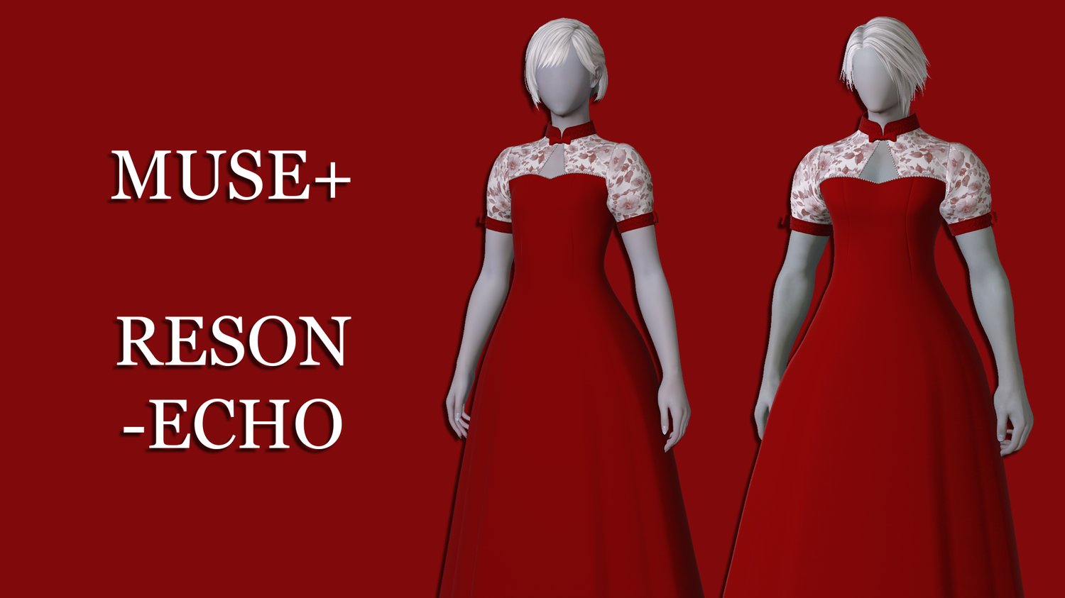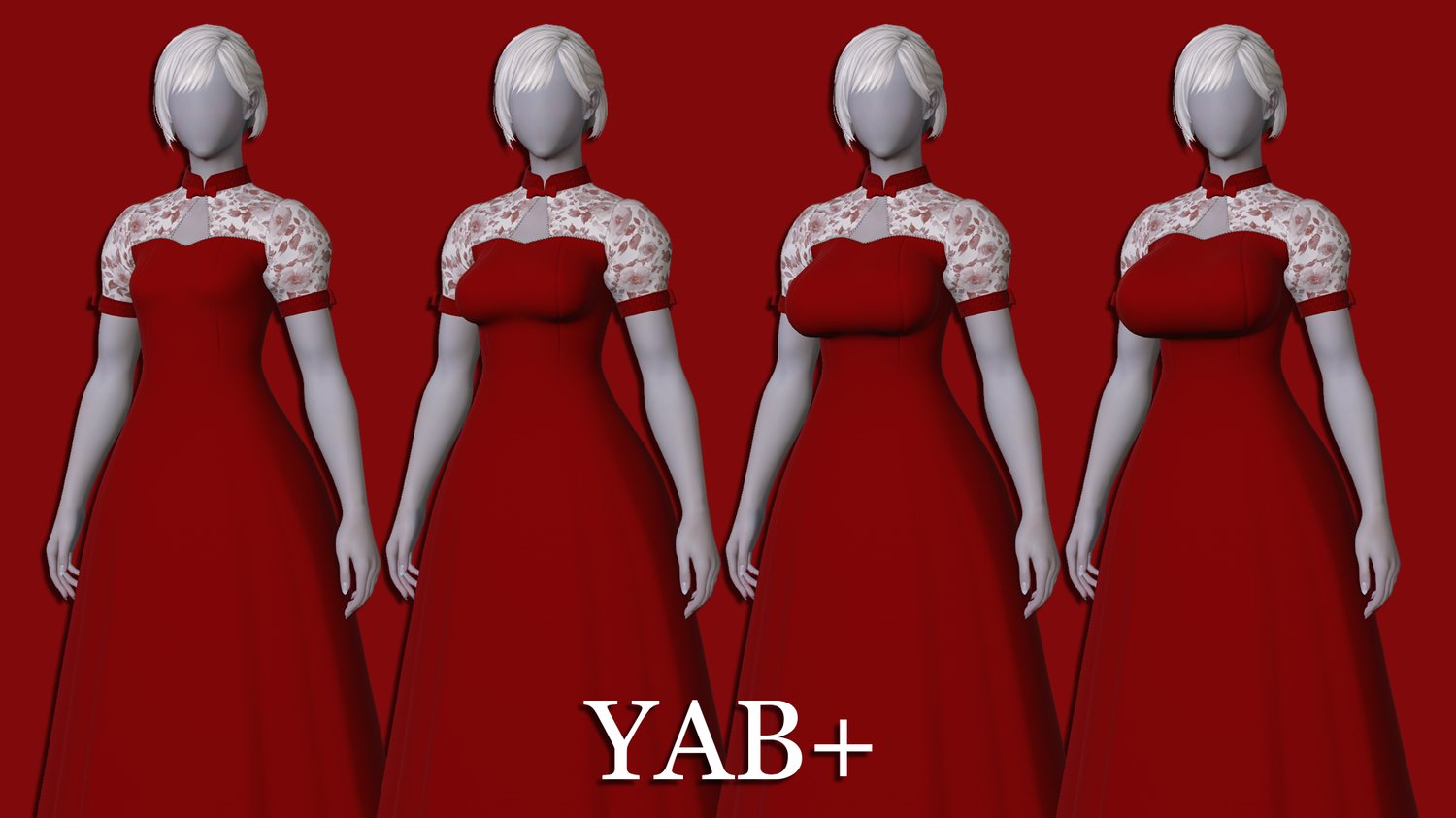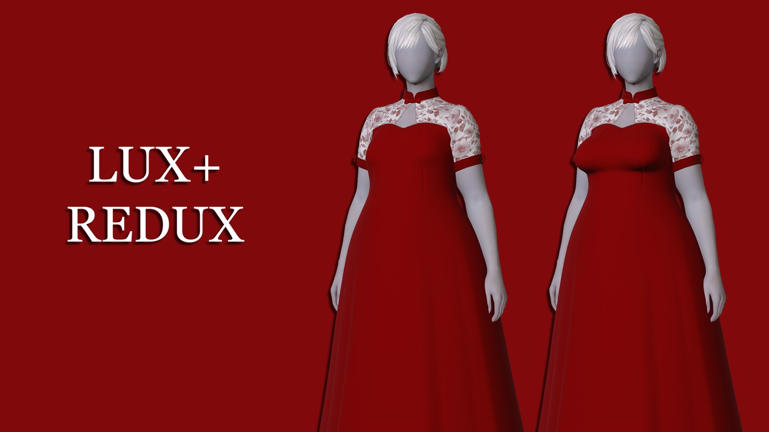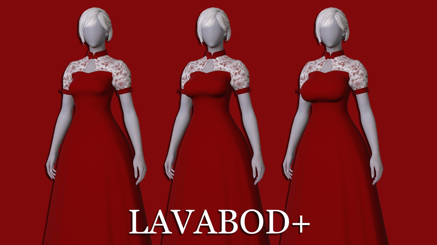 Dress is bi-colored and adorned with pearls and bows, with four patterns available for the upper top area and has dual dyeing enabled. All versions of the cheongsam (sans Lux+ RE and Resonecho) have skirt clearance that accommodate up to LavaBod+ standard legs.