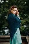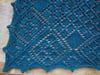 Shawl is knit from the border edge up to the top center point of the shawl, decreasing four stitches on every right-side row. The final 12 stitches are grafted together. At first the yarn is used up quite quickly, and it doesn’t seem that there will be enough, but at the top the rows go faster than the yarn does. The final rows are so short that they seem to fly by, making up for the slowness of the earlier ones.