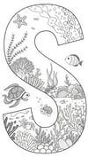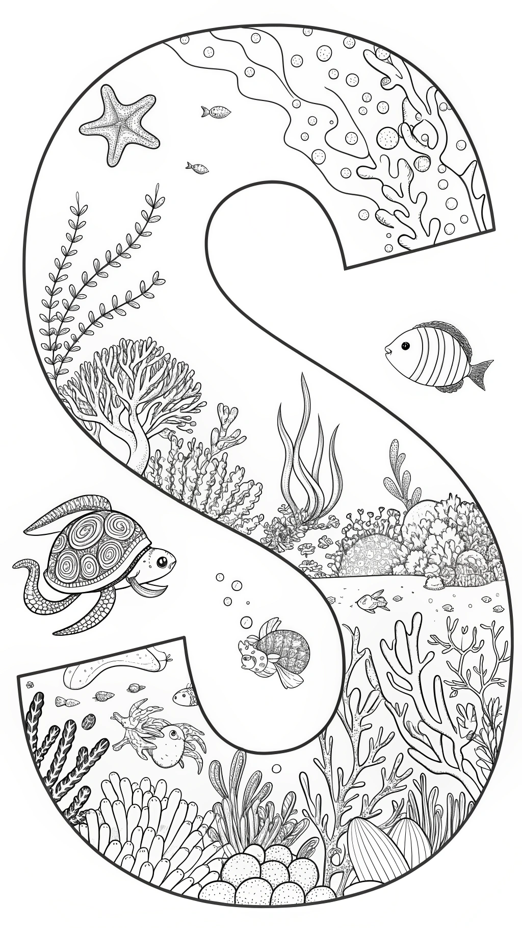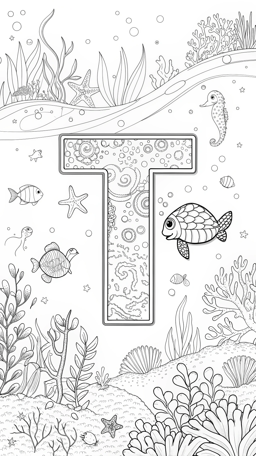 - Playful dolphins, turtles, crabs, and colorful fish swimming around each letter