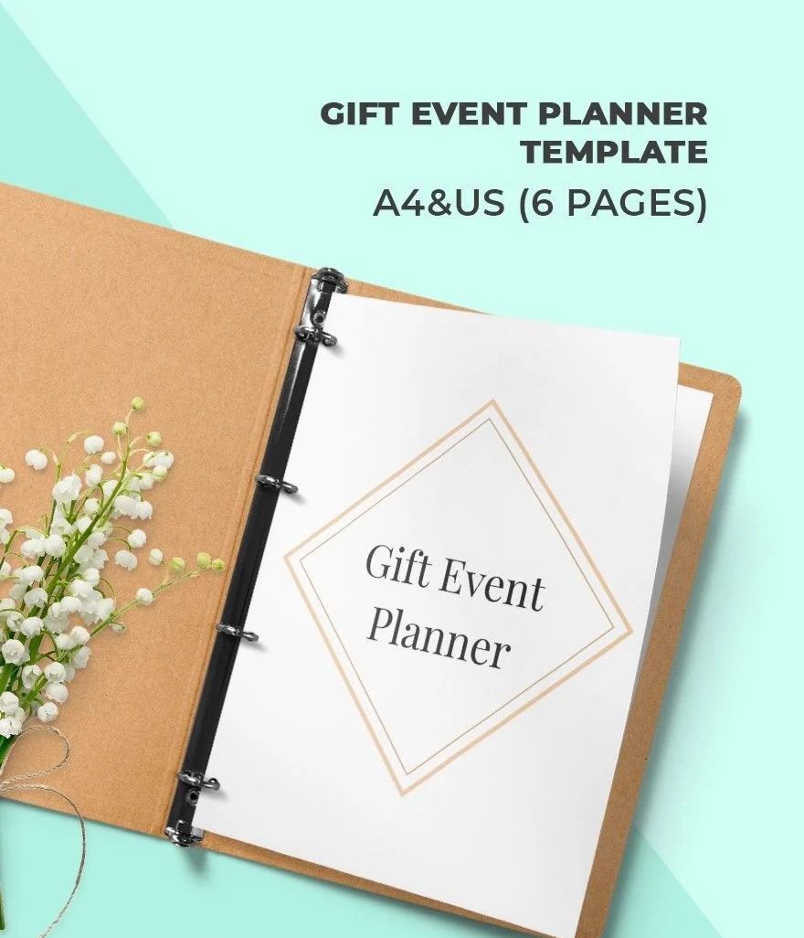 Gift Event Planner Template (6 pages). Plan budget, guests, menu, timeline and tasks for celebrations. A4/Letter PDF. Instant download link plus email delivery.