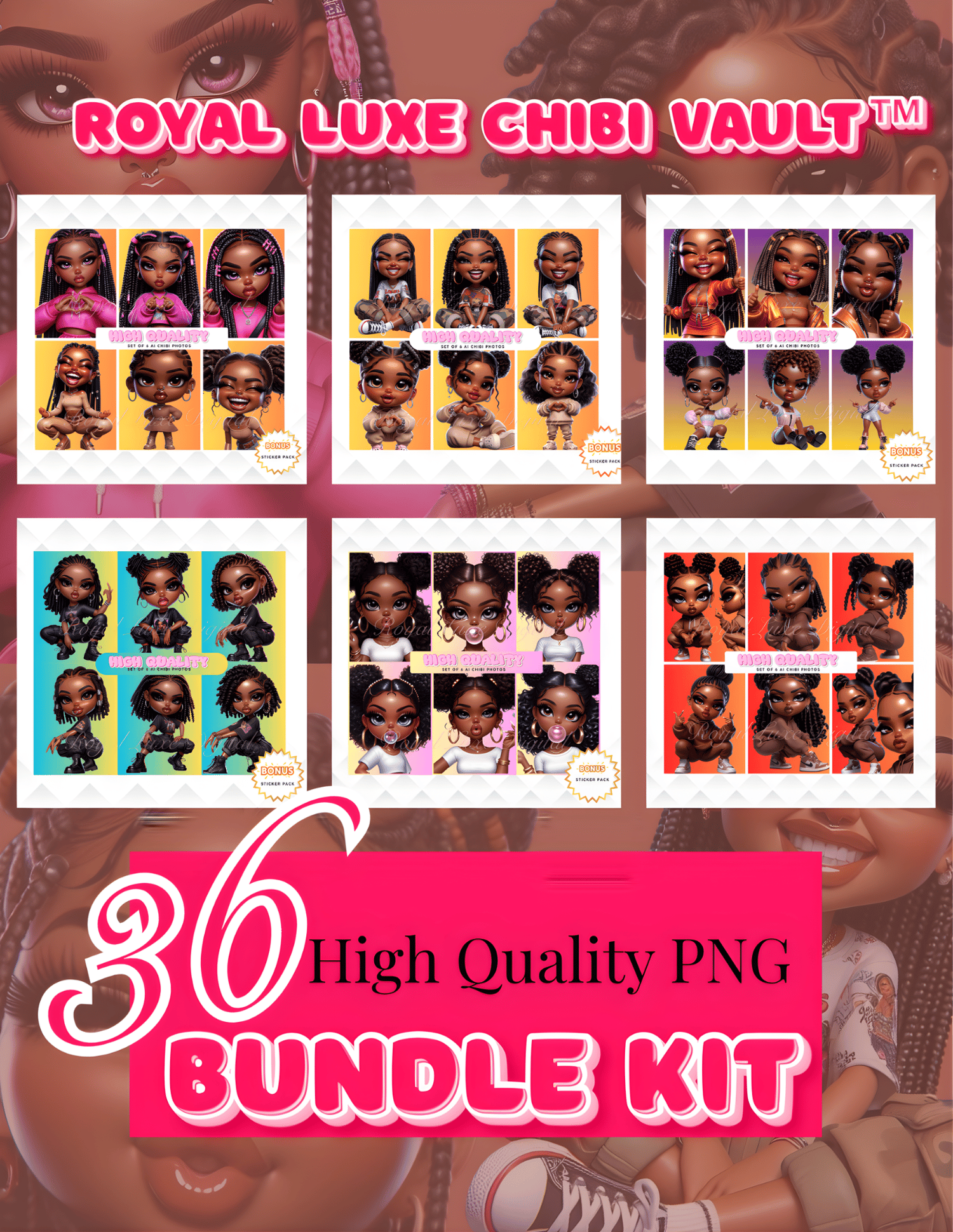 36 High Quality AI Chibi Bundle Kit (6 PNGs + BONUS Sticker Pack)