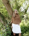 Cleo is a fabulous, versatile garment that can be worn in a variety of ways – as a skirt; as a poncho (with the ribbing making the roll neck), or as a “boob-tube” dress (accessorised with a belt). Cleo is really interesting to make as it includes several techniques such as circular knitting, ribbing, cabling and short row shaping. There is only one seam to finish and the border is incorporated as you knit. The rib is picked up at the end and worked up making the length of the waist rib adjustable.