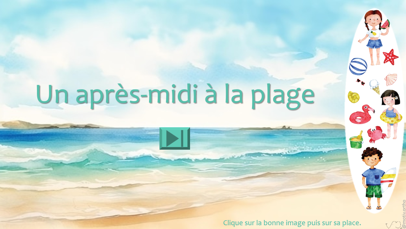 Dans cette scène tout en douceur, les enfants passent l'après-midi à la plage. Le patient doit placer les personnages et objets sur la plage, transcrire les mots correspondant aux dessins, lire un texte, et élaborer des phrases avec des mots imposés. Un support très complet pour travailler la lecture, la compréhension et la transcription.