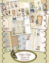 Create your own delightful Folder Style junk journal! This kit features shades of blue, brown and pink which includes vintage-style designs with a variety of roses, cottage flowers, butterflies, birds, ribbons, a dreaming girl, vintage wallpaper and vintage graphic images with script & other design elements including sentiments. Fold to create journal pages. Folder Cover approximately measures 4 1/4" wide x 8 1/2" tall. Journal pages fit inside the folder style cover with a pocket. Kit includes journal pages, tags, journal cards, envelope, background pages, tea dyed backer page, ephemera and folder cover with pocket and inside folder cover pages. A smaller size journal with all the punch of a regular size journal.