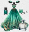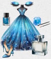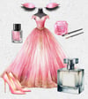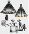 Evening dress, ball gown, prom, New Year. 7 dresses + accessories; shoes, eyes. Eye shadow, nail varnish and a large perfume bottle with room to personalise. clipart. 30 PNGs. Ideal for Birthday, wedding, party invitations etc.