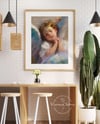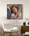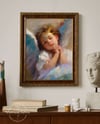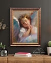 This artwork portrays a cherubic angel in an impressionistic style, skillfully capturing their essence with thick, impasto brushstrokes. The angel's elegant and graceful figure emits an undeniable aura of innocence and purity. Soft and refined hues dominate the color palette, comprised mainly of muted pastels and warm, earthy tones.