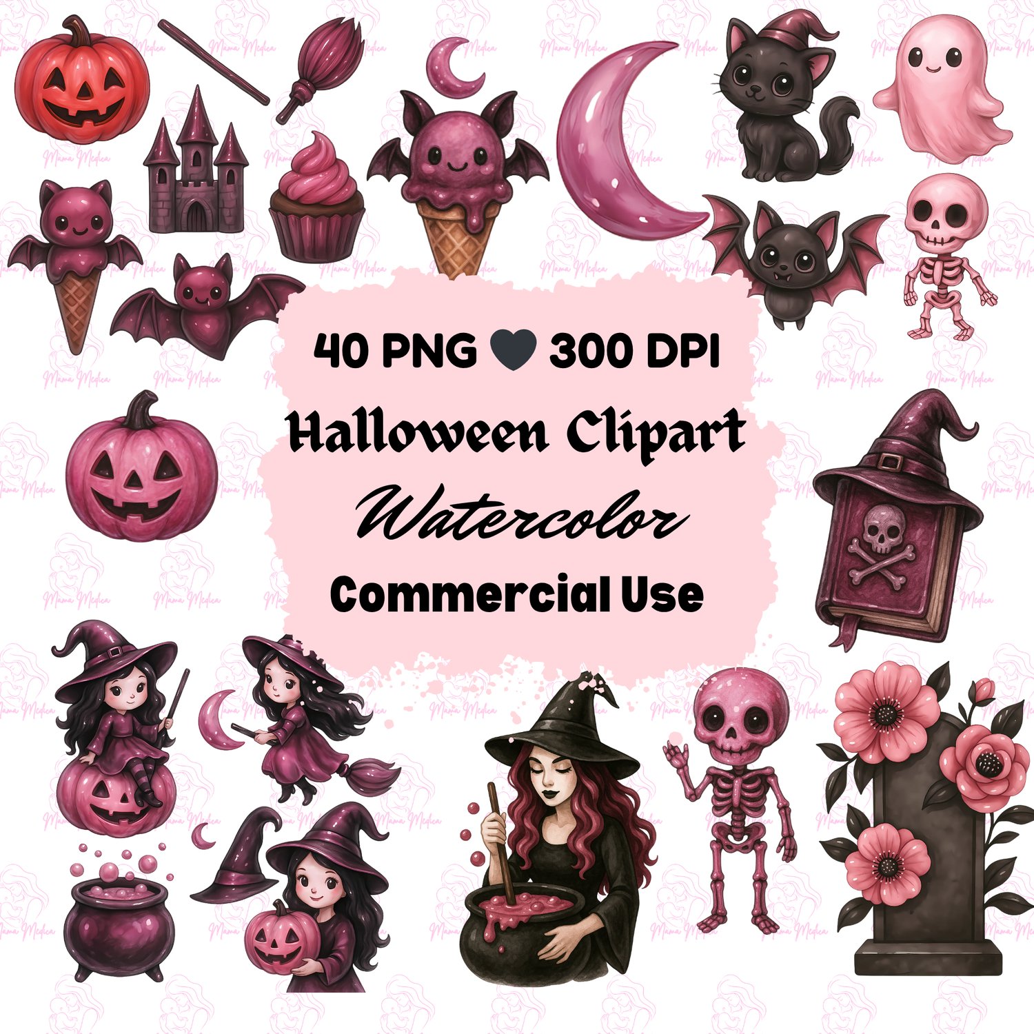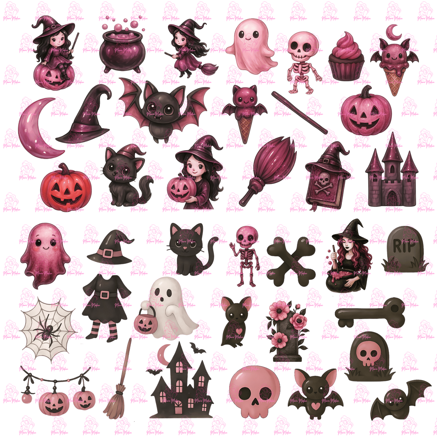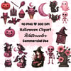 Bundle 40 PNG Watercolor Black and Pink Gothic Halloween Clipart Set