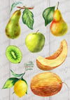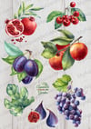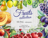 Set of watercolor fruits: grapes, lemon, green apple, red apple, melon, kiwi, pomegranate, figs, fig leaf, yellow pear, green pear, cherry, plum