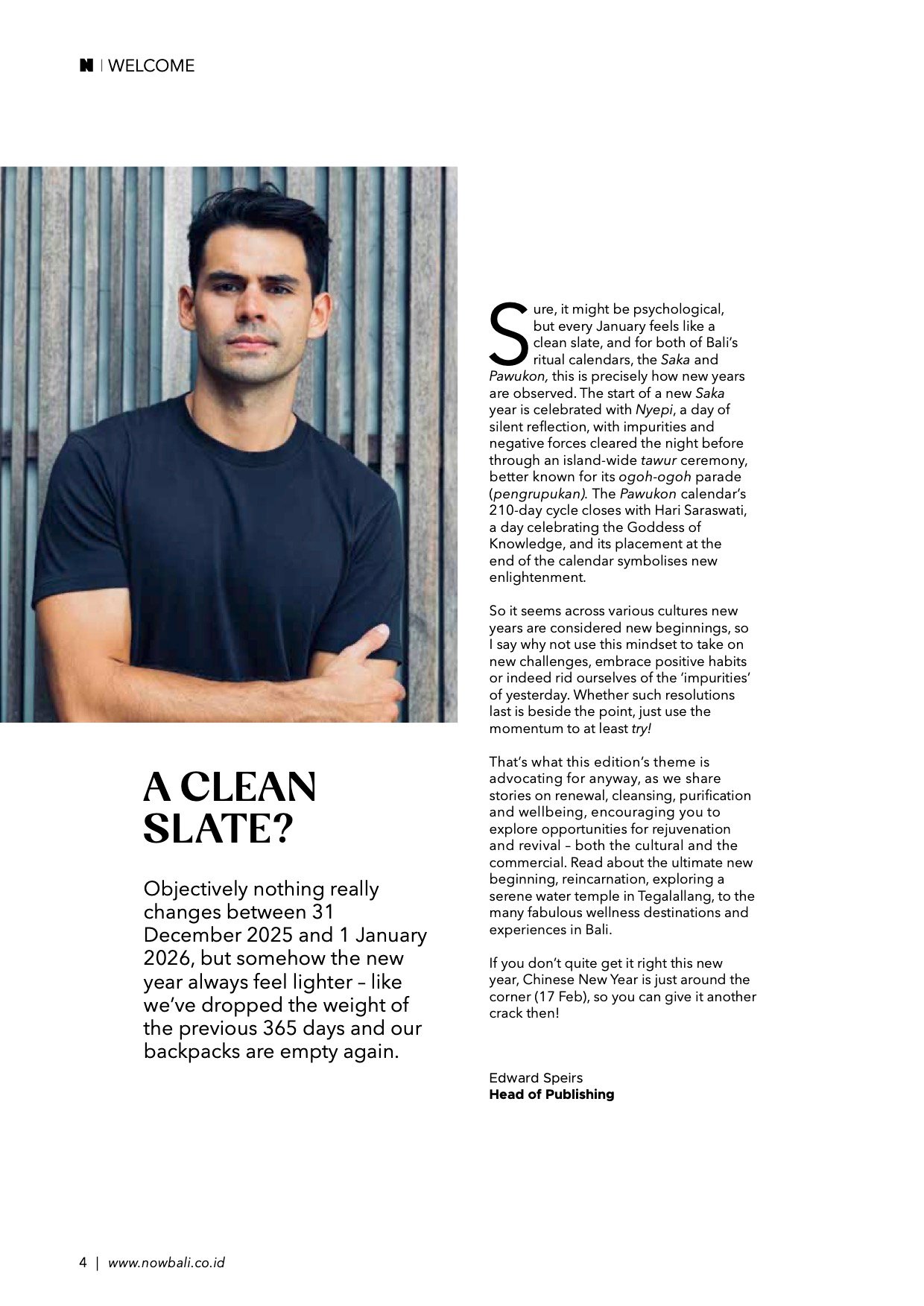 Bali has always been a place for renewal, far before the likes of 'Eat, Pray Love' and 'healing' tourism. Belief in reincarnation, in cleansing and purification, in abrupt changes in life paths, these have created fertile grounds for the island to become a wellness haven. In this edition of NOW! Bali, we explore the philosophical, cultural and experiential aspects of new beginnings in Bali.