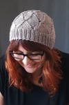 A pretty beanie hat with lace work throughout.