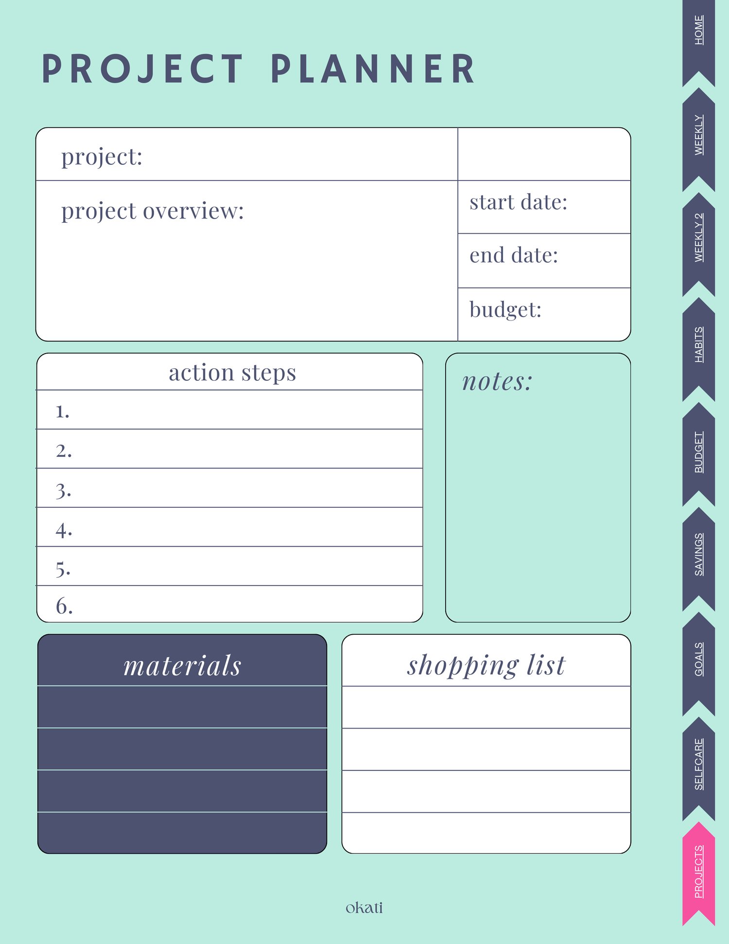 - Project Planner: Plan your projects with colorful overviews, budgets, and action steps.