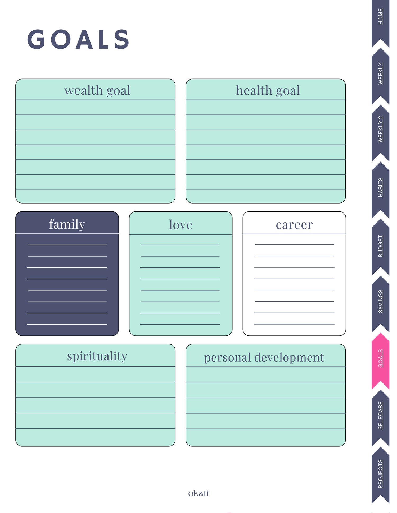 This bright and cheerful digital planner in pink, teal, and navy blue helps you set goals and track your habits. The navigation bar lets you easily browse through the pages, making planning simple and fun.