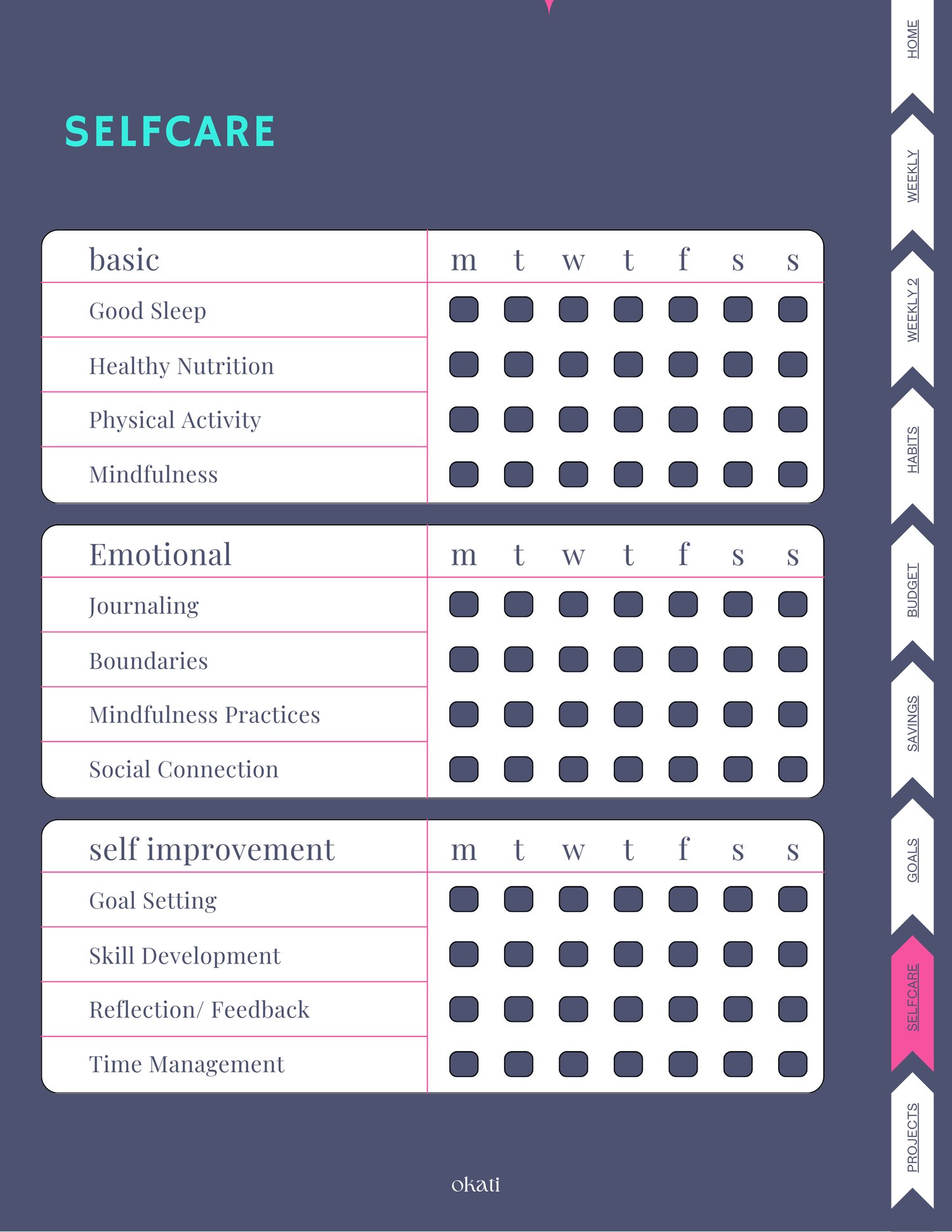 - Self-Care: Focus on wellness with sections for sleep, nutrition, emotional well-being, and self-improvement.