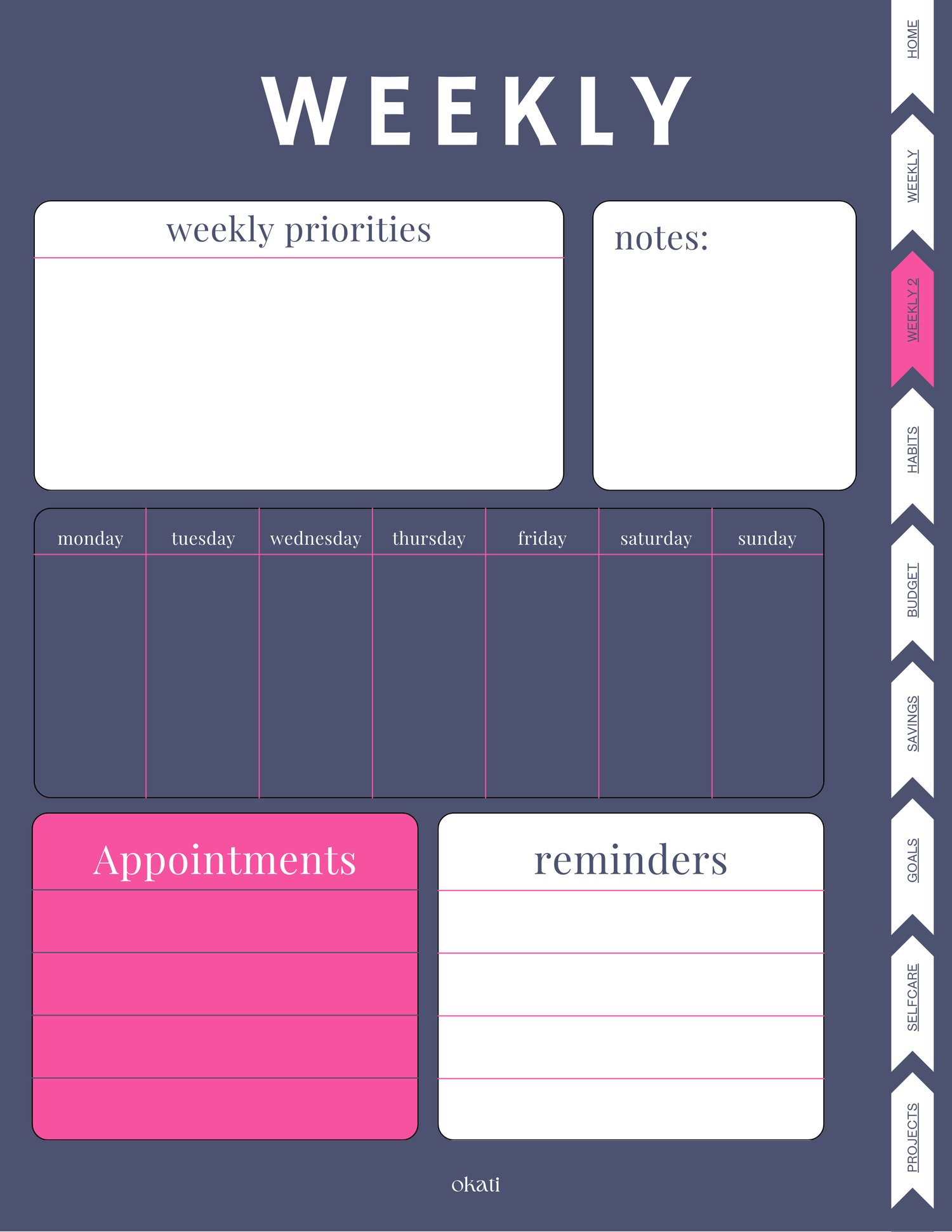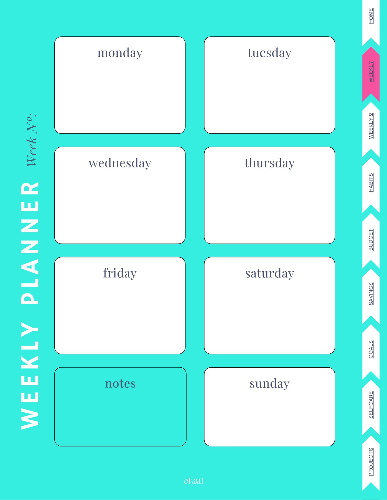 - Home: Access all sections of your planner with a colorful navigation bar.