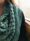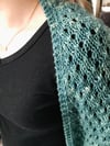 There is a famous lighthouse in this coastal village that lights up the area with spots of light that dapple the air and water. Just like the graphic radiating stripes dapple the stockinette background of this blue green shawl.